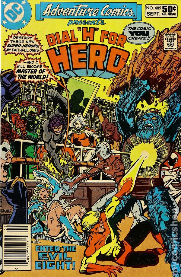 Newsstand Edition. Last 50-cent cover price issue. Cover art by George Perez. The Evil Eight!--Dial "H" For Hero, script by Marv Wolfman, pencils by Carmine Infantino, inks by Dennis Jensen. No Freedom For Fairfax!--Dial "H" For Hero, script by Marv Wolfman, pencils by Carmine Infantino, inks by Frank Chiaramonte. In Final Combat--Dial "H" For Hero, script by Marv Wolfman, pencils by Carmine Infantino, inks by Larry Mahlstedt. All stories feature heroes created by fans. 36 Pages, Full Color. Cover price $0.50.
