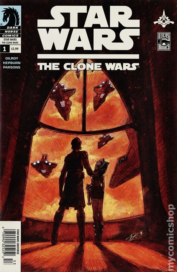 Newsstand Edition. Story by Henry Gilroy. Art by Scott Hepburn and Dan Parsons. Cover by Dave Filoni. Set in the time between Attack of the Clones and Revenge of the Sith, this new series will focus on the legendary Clone Wars! Some of your favorite Jedi: Obi-Wan Kenobi, Anakin Skywalker, Master Yoda, Master Mace Windu, and others, will be joined by a few new faces as they fight to maintain the true spirit of the Republic. ? In addition to the lead story, each issue will feature a backup story by one of the artists from the TV series! ? This new series will be a compliment to Lucasfilm's highly anticipated CGI-animated The Clone Wars movie and television programs! This is Star Wars for a new generation! FC, 40 pages Cover price $2.99.