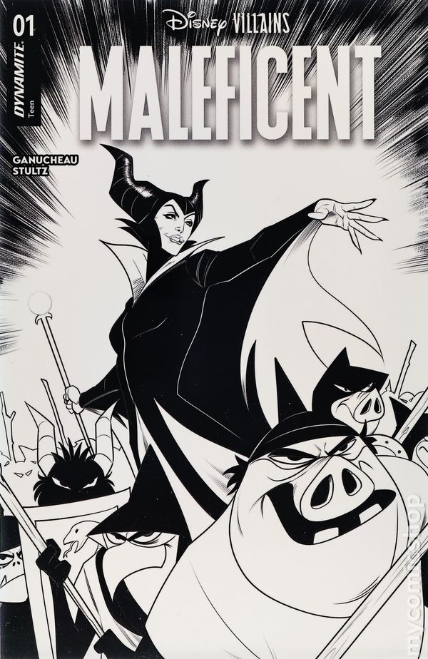 Blind Bag Exclusive B&W Variant Cover by Robert Quinn. Story by Paulina Ganucheau. Art by Theo Stultz. JOURNEY INTO DARKNESS! The Queen of the Forbidden Mountain returns for an all-new tale of villainy crafted by writer PAULINA GANUCHEAU and artist THEO STULTZ! Set in the time just after the vengeful Maleficent leveled her curse against Princess Aurora, this hypnotic new adventure follows the power-hungry regent as she sets out to build up her arsenal of magical energy to the point that she will be invulnerable to any force that would dare challenge her reign. When her goblin minions return from a raid against a neighboring kingdom bearing a mysterious glowing grimoire, the Queen senses an ancient and otherworldly presence between its covers — a force that could deliver to her a new wellspring of nearly unlimited power. To take possession of it, however, she must leave the safety of her kingdom and venture into an unfamiliar and dangerous realm — a place from which few humans ever return! Featuring darkly beautiful covers by PAULINA GANUCHEAU, ELLERY SANTOS, ROBERT QUINN, and THEO STULTZ, Disney Villains: Maleficent Vol. 2 #1 adds a new layer of complexity to one of Disneys most compellingly sinister antagonists! 32 pages, full color, rated teen.