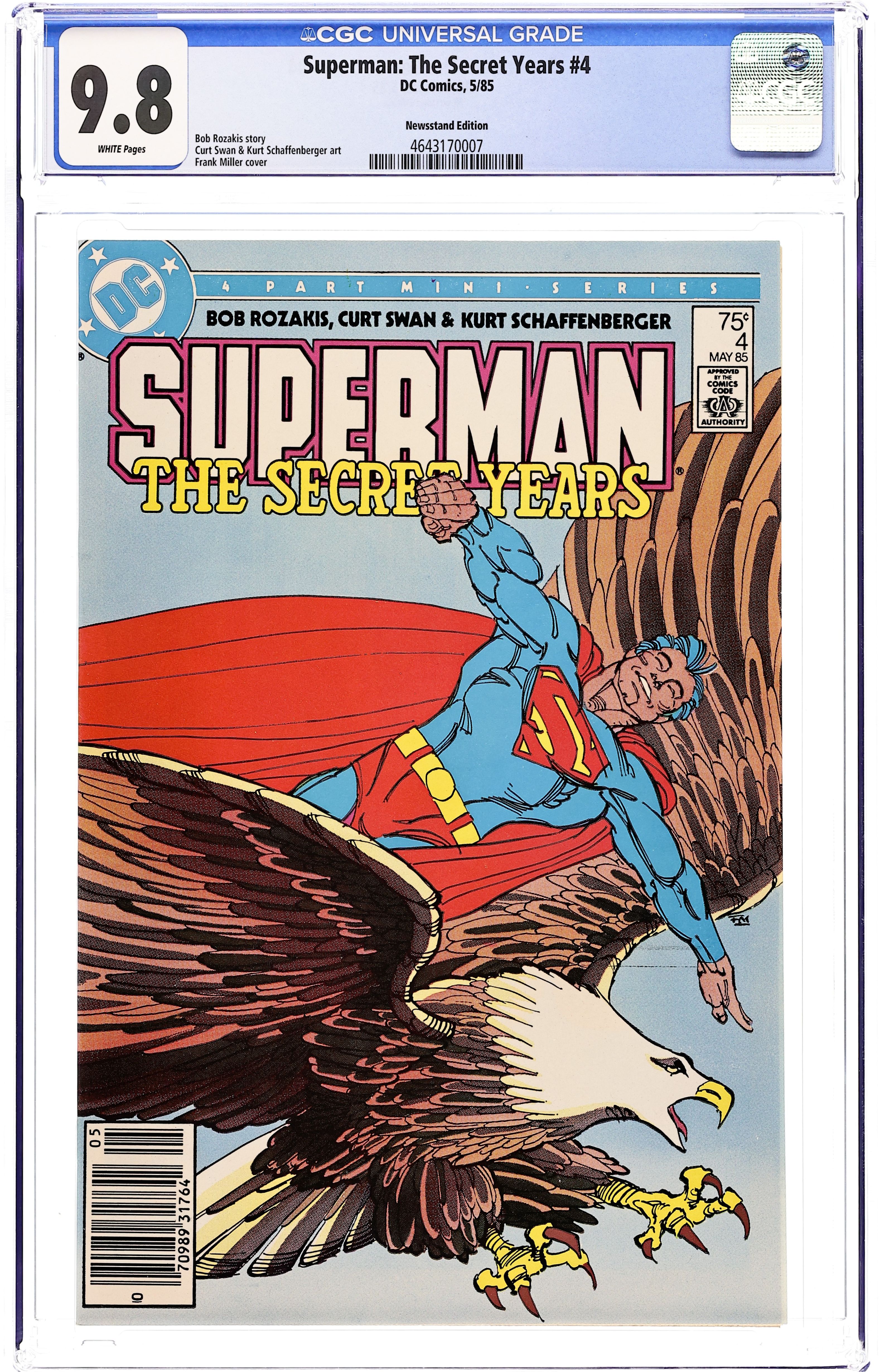 Newsstand Edition. Script by Bob Rozakis, art by Curt Swan & Kurt Schaffenberger. Cover by Frank Miller. Kal-El of Krypton grew up in Smallville, living the dual lives of Superboy and Clark Kent until his adoptive parents, the Kents, died shortly after his high school graduation. As an adult, Superman is the hero of Metropolis, working as a mild-mannered newsman in his Clark Kent identity, but what happened between these two periods? Now the answers are revealed! THIS ISSUE: Luthor challenges Superman to combat, while Perry White tries to track down the Man of Steel in "Beyond Terminus." Cover price $0.75.