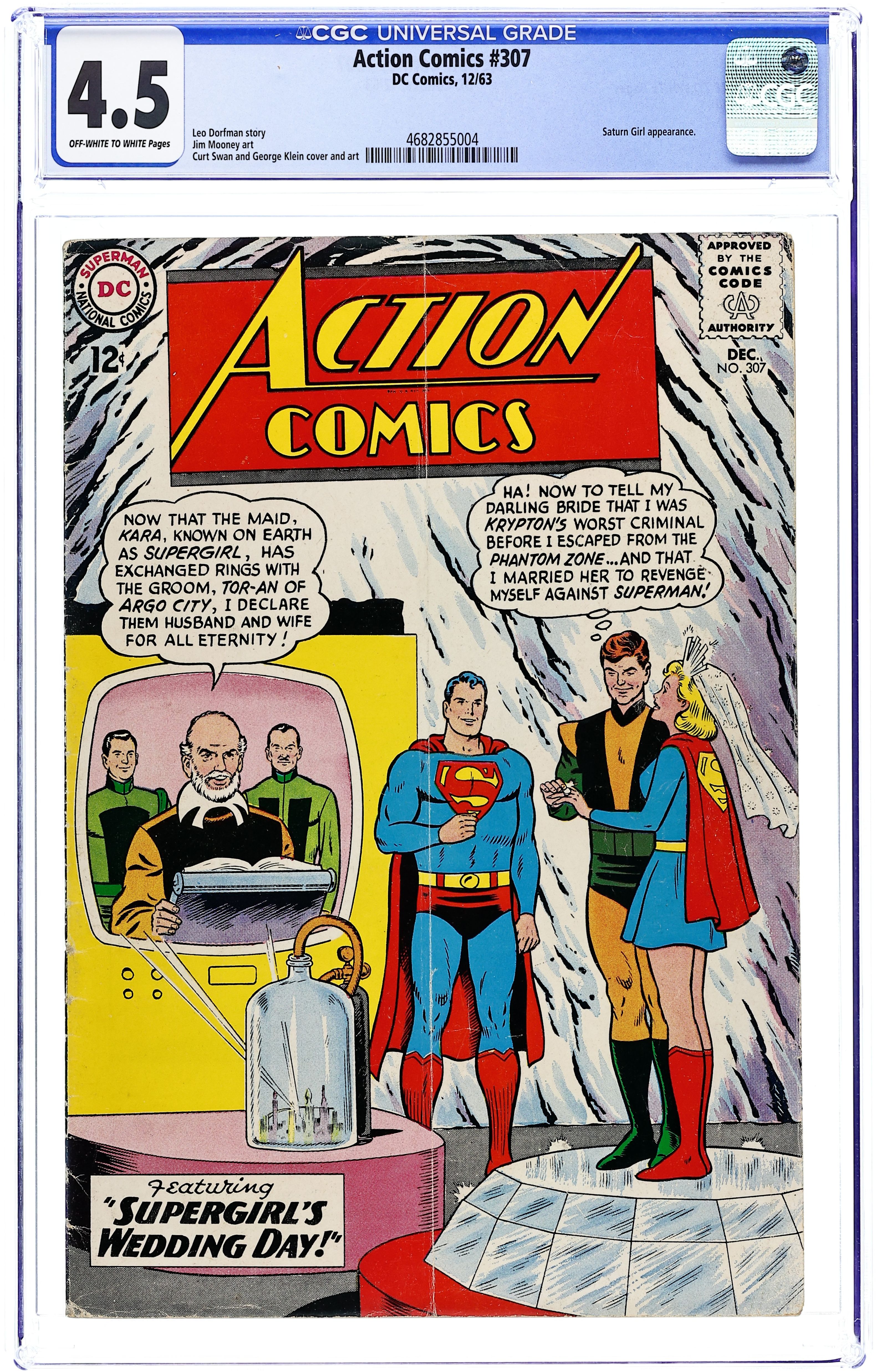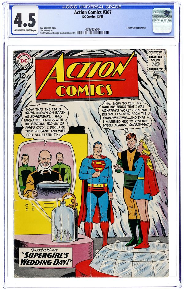 Cover pencils by Curt Swan, inks by Sheldon Moldoff. Mon-El appearance in "The Babe of Steel!", script by Robert Bernstein, pencils by Curt Swan, inks by George Klein; Superman uses red kryptonite to become baby-sized in order to get through a hole in the Phantom Zone that threatens to become larger. Ad for Superman Annual. Supermen of America ad. "The Strange Bodies of Supergirl!", script by Jerry Siegel, art by Jim Mooney; Supergirl deals with the effects of three Red Kryptonite meteors, the last of which turns her into a mermaid; She visits Atlantis, where Jerro proposes to her, but neither of them realizes that Lori's sister Lenora is also in love with Jerro. Batman ad. Letter to the editor from E. Nelson Bridwell. 36 Pages, Full Color. $.12 "This is Part 3 of 4 of a running gag of covers that homage each other by legendary Superman artist Curt Swan that ran from 1958 to 1963. It is a series of covers I'm calling "The Desk Smash," and they appeared on the covers for Action Comics #237, 264, 284, and 302." – Odinson, mycomicshop.com Archivist. Cover price $0.12.