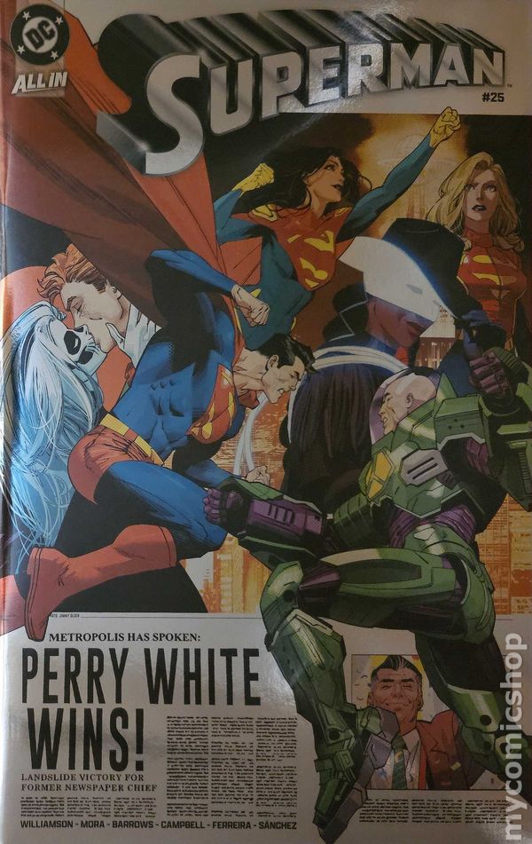 Limited 1 for 25 Retailer Incentive Variant Cover. Written by Joshua Williamson. Art by Dan Mora, Eddy Barrows, Eber Ferreira, Jamal Campbell. Cover by Dave Johnson. REMATCH OF THE CENTURY: SUPERMAN VERSUS LEX LUTHOR! Superman and Superwoman are still reeling from their epic battles against Doomsday and Time Trapper, but a bigger problem just appeared...Lex is back! Lex's memory was erased during the House of Brainiac arc, but now Superman's greatest enemy has returned with a twist, and he's ready for a fight to control Supercorp and Metropolis. Is this the end of Supercorp?! Prepare for a shocking oversize issue that celebrates the last two years of Superman, connects to the Summer of Superman, and sets up a brand-new storyline! 40 pages, full color. Rated T+ Cover price $6.99.