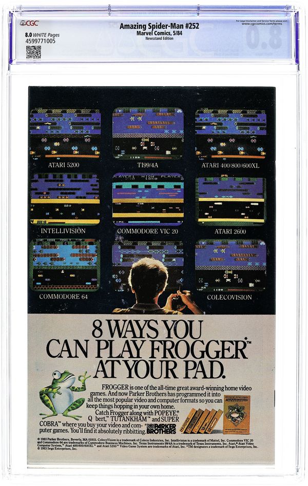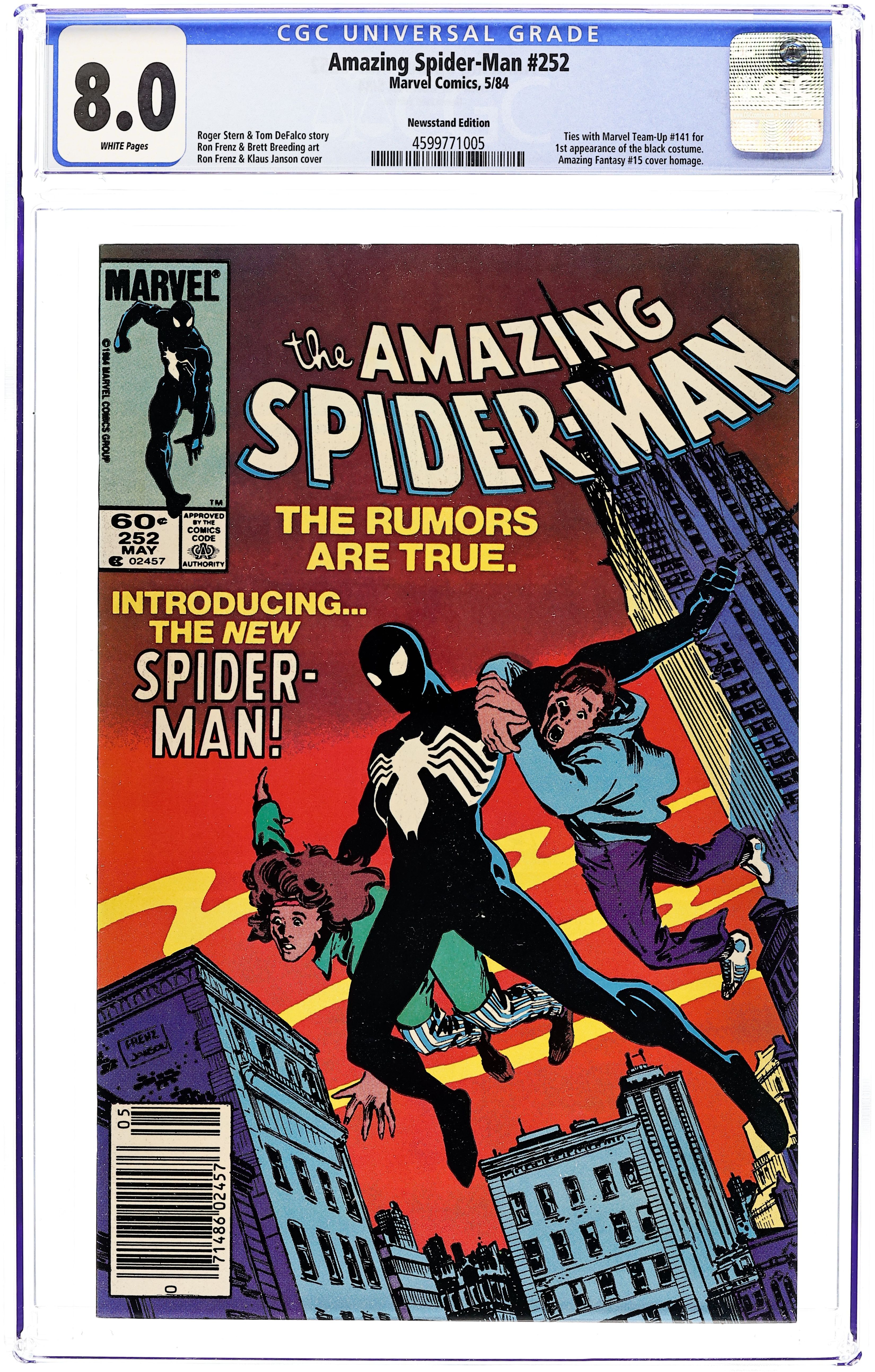 Tags: Chronological Appearances of Spider-Man's Black Costume (part 09 (1st Official Debut)), Marvel Legacy Numbering: Amazing Spider-Man (part 252), Secret Wars (1984) (part Aftermath 01), Spider-ManAmazing Spider-Man (1963 1st Series) 252N CGC 8.0 Newsstand Variant