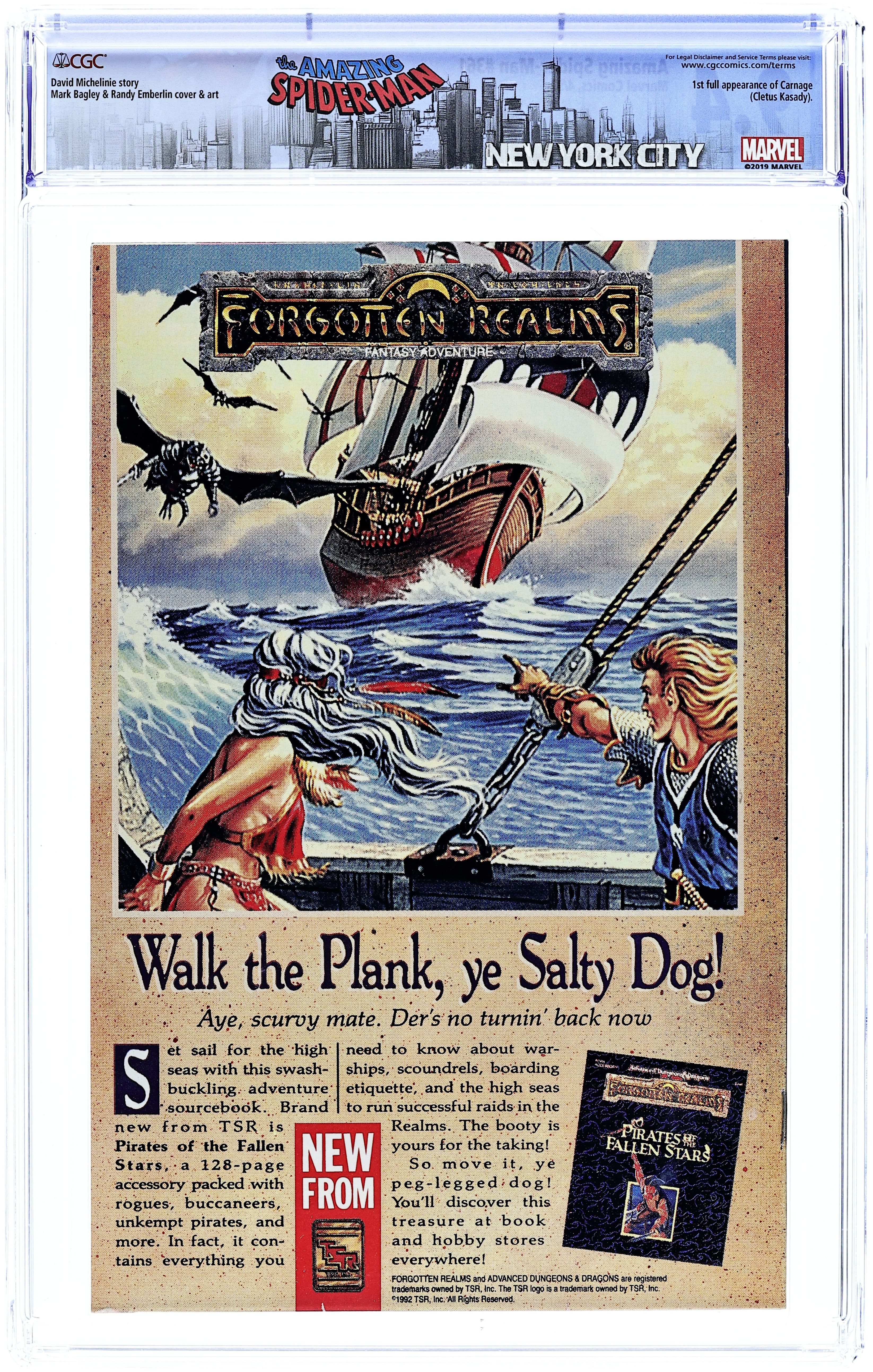 Starts May 18 First Printing. Direct Edition. First (full) appearance of Carnage in "Savage Genesis!" Part 1 of 3. Script by David Michelinie. Pencils by Mark Bagley. Inks by Randy Emberlin. Cover by Mark Bagley and Randy Emberlin. Blood runs in the streets as a serial killer roams New York City! And as the web-slinger investigates the murders, he notices a very disturbing similarity to another killer's modus operandi! In a burned-out building in Brooklyn, the spectacular one comes face-to-face with his new homicidal foe...Carnage! Can the wall-crawler end Cletus Kasady's rampage in their very first encounter? Cameo appearances by Aunt May and Mary Jane Watson. Flashback cameo by Venom. (Note: This three-part story was reprinted in 2011 in the trade paperback: Spider-Man -- The Vengeance of Venom.) 36 pages, full color. $1.25 cover price. NOTE: Most of these were distributed with slight printer tears in the bottom edge of the cover. Cover price $1.25.