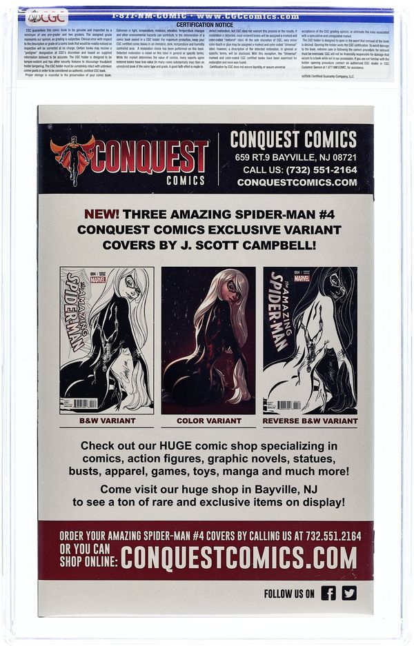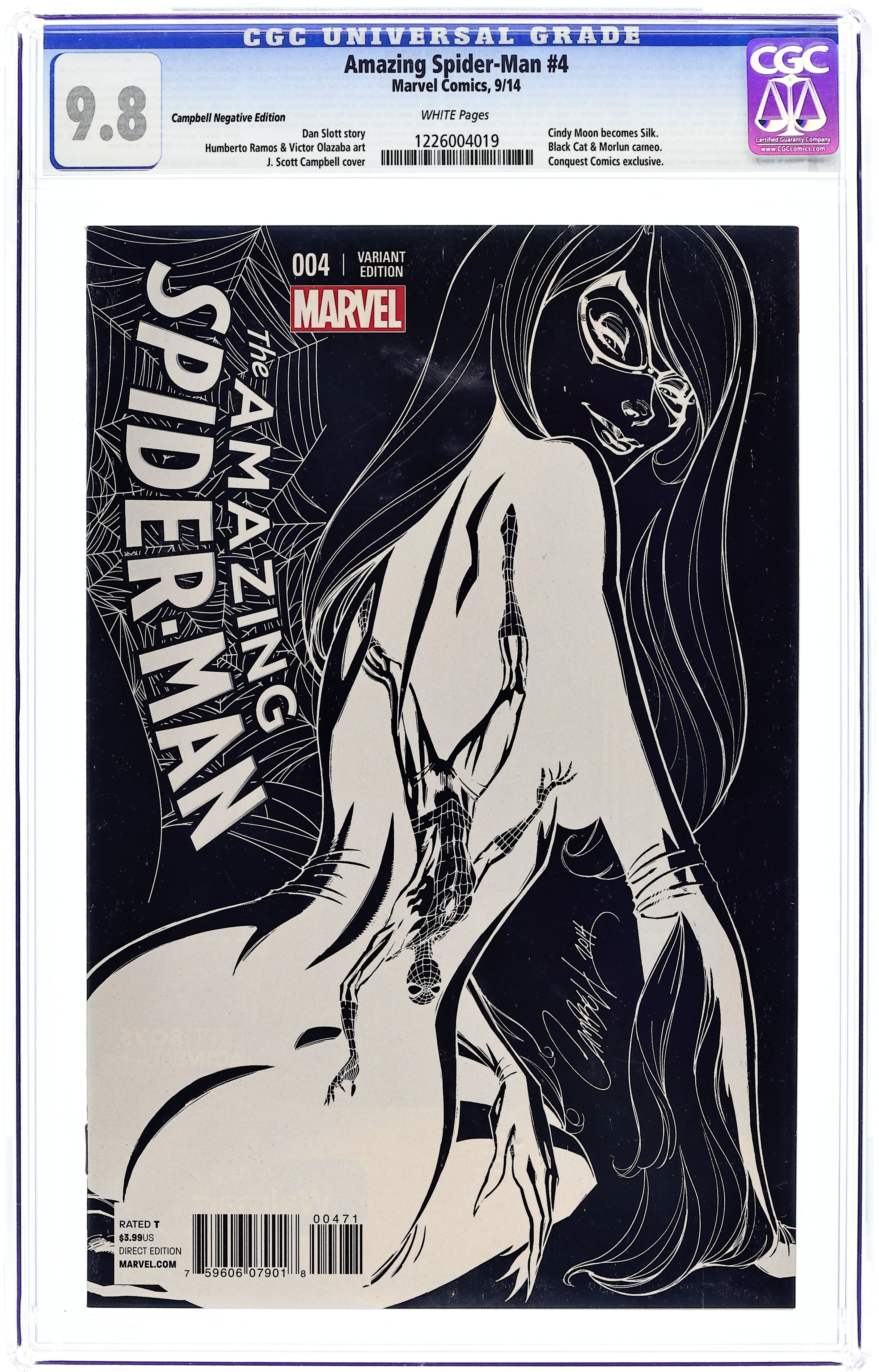 Conquest Comics Reverse B&W Sketch Variant by J. Scott Campbell. 1st appearance of Silk. Written by Dan Slott. Art and Cover by Humberto Ramos. ORIGINAL SIN tie-in! The radioactive spider that gave Peter Parker his powers bit someone else, too! Who is Silk and where has she been? Don't miss this incredible new character who will be a major Spider-player for the whole year! 28 pages, full color.