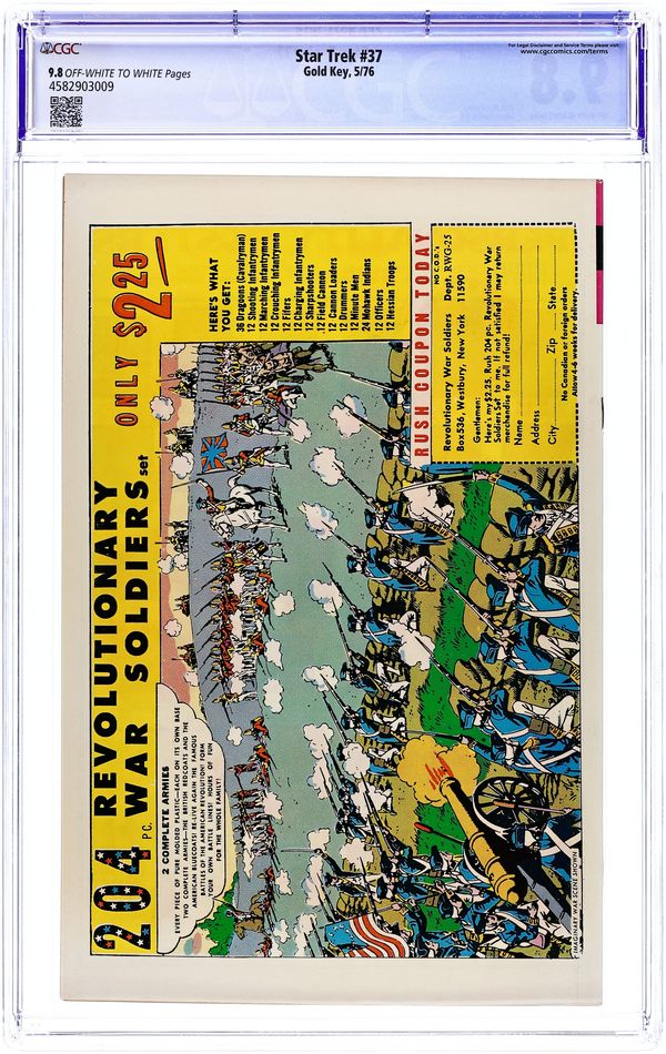 Ends Jan 14 8:18 PM CST Bid History 24 bids Current Bid $591 Your Secret Max Bid If you'd like to bid, please log in or register. Comic book version of the original Star Trek TV series that starred William Shatner and Leonard Nimoy. Photo cover of Leonard Nimoy, William Shatner, & George Takei. Photo of U.S.S. Enterprise inside front cover. Note: There is ONLY one version of this issue. It has a photo of William Shatner on the back cover. There is no version of this issue with an ad on the back. "The Planet of No Return," script by Dick Wood, art by Nevio Zeccara; An expedition team discovers its secret too late... K-G, Planet of Death!; The planet K-G is a plant dominated planet that sends out spores that change mammals into plants; They also eat mammals; The crew beams down five crewmen and you never know who will make it because no one wears red. 36 pgs., full color. $0.12. Cover price $0.12.