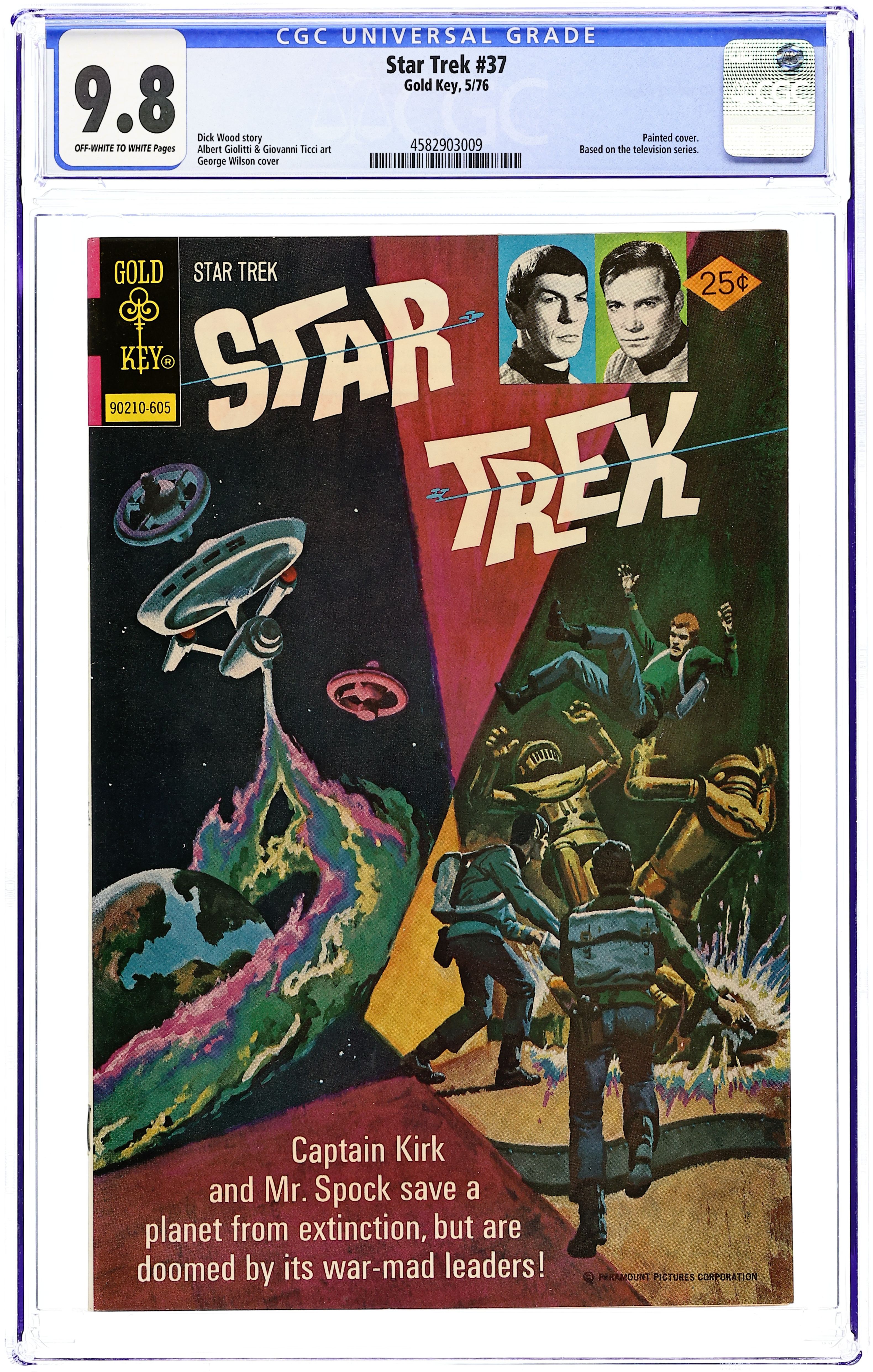Comic book version of the original Star Trek TV series that starred William Shatner and Leonard Nimoy. 90210-605. Painted cover by George Wilson, with inset photos of William Shatner as Kirk and Leonard Nimoy as Spock. "The Ghost Planet," script by Dick Wood, pencils by Albert Giolitti, inks by Giovanni Ticci; Captain Kirk and Mr. Spock save a planet from extinction, but are doomed by its war-mad leaders. 36 pgs., full color. $0.25. Cover price $0.25.