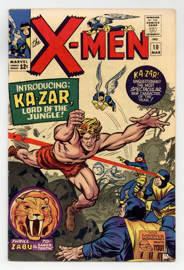 Starts Jan 3 Cover pencils by Jack Kirby, inks by Chic Stone. The Coming of Ka-Zar, script by Stan Lee, pencils by Jack Kirby, inks by Chic Stone; Even though he is not a mutant, Xavier allows the X-Men to travel to Antarctica and enter the Savage Land to investigate the noble savage, Ka-Zar; They end up having to save Jean and Warren from being sacrificed by the savage Swamp Men; 1st Silver Age Ka-Zar. (The original Ka-Zar appeared in Marvel Comics #1 and Marvel Mystery Comics between 1939 andf 1942.) 36 pgs. $0.12. Cover price $0.12.