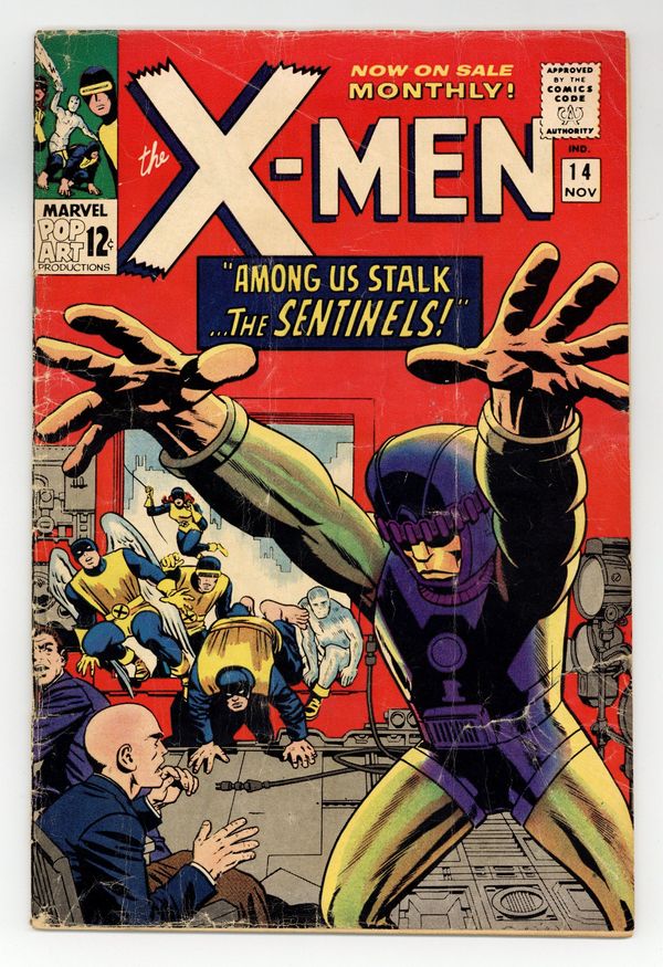 Starts Apr 4 Cover pencils by Jack Kirby, inks by Wally Wood. Among Us Stalk...The Sentinels!, script by Stan Lee, pencils by Jack Kirby (layouts) and Werner Roth [as Jay Gavin] (pencils), inks by Vince Colletta; After their battle with the Juggernaut, Xavier sends the X-Men on vacation; Reading a story in the paper about Dr. Trask and his story on the mutant menace, Professor X calls for a televised debate with the anthropologist; During the broadcast, Trask unveils his Sentinels, robots who were built to capture and nullify mutants, but things quickly get out of hand as the Sentinels proclaim themselves superior to puny humans and prepare to take over; Xavier calls his X-Men to help and they return to battle the Sentinels; When one of their number falls, the giant robots capture Trask and return to their base; The X-Men follow and find a hidden complex complete with devastating weaponry aimed directly at them; 1st appearance of the Sentinels. 36 pgs. $0.12. Cover price $0.12.