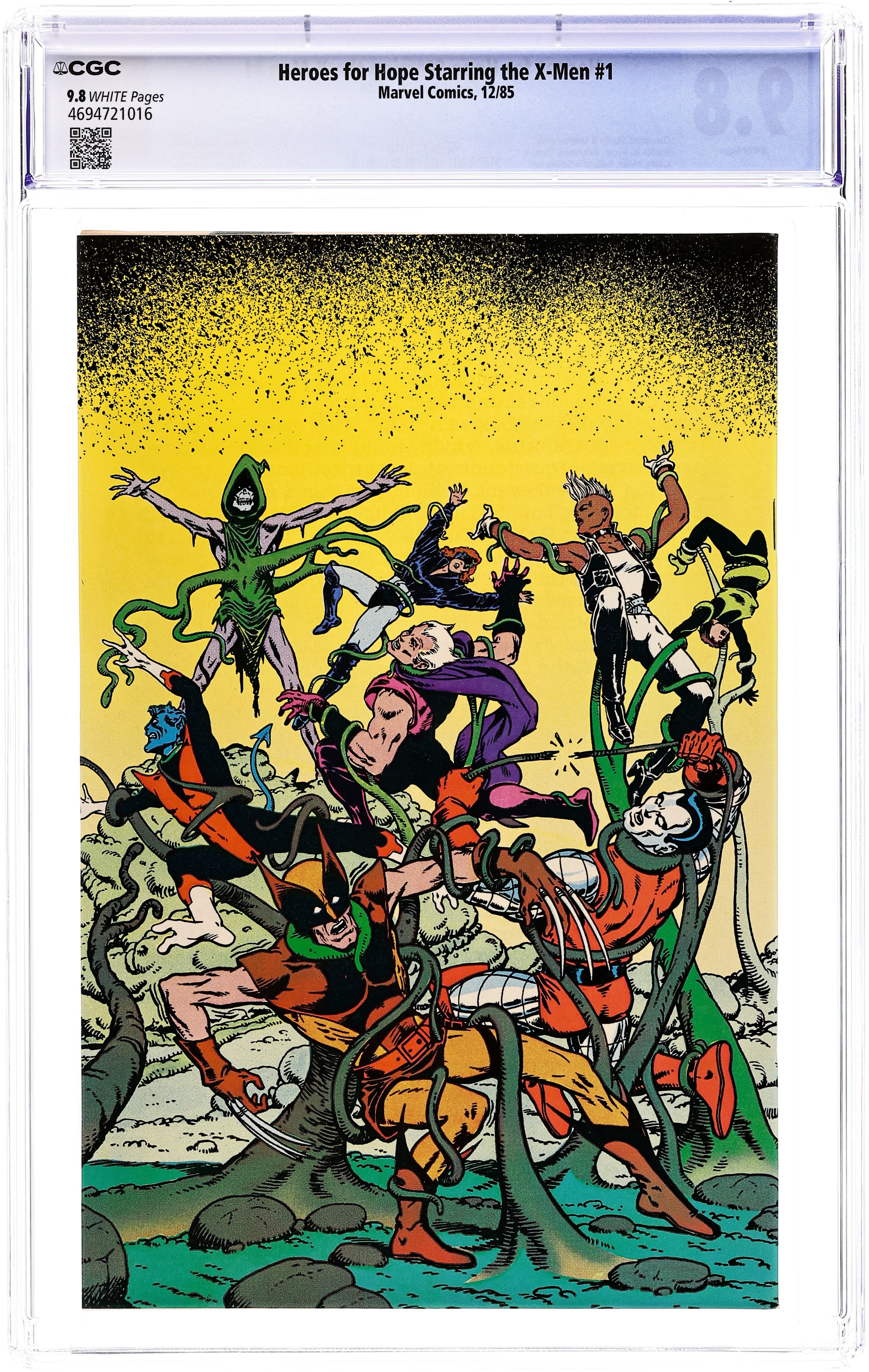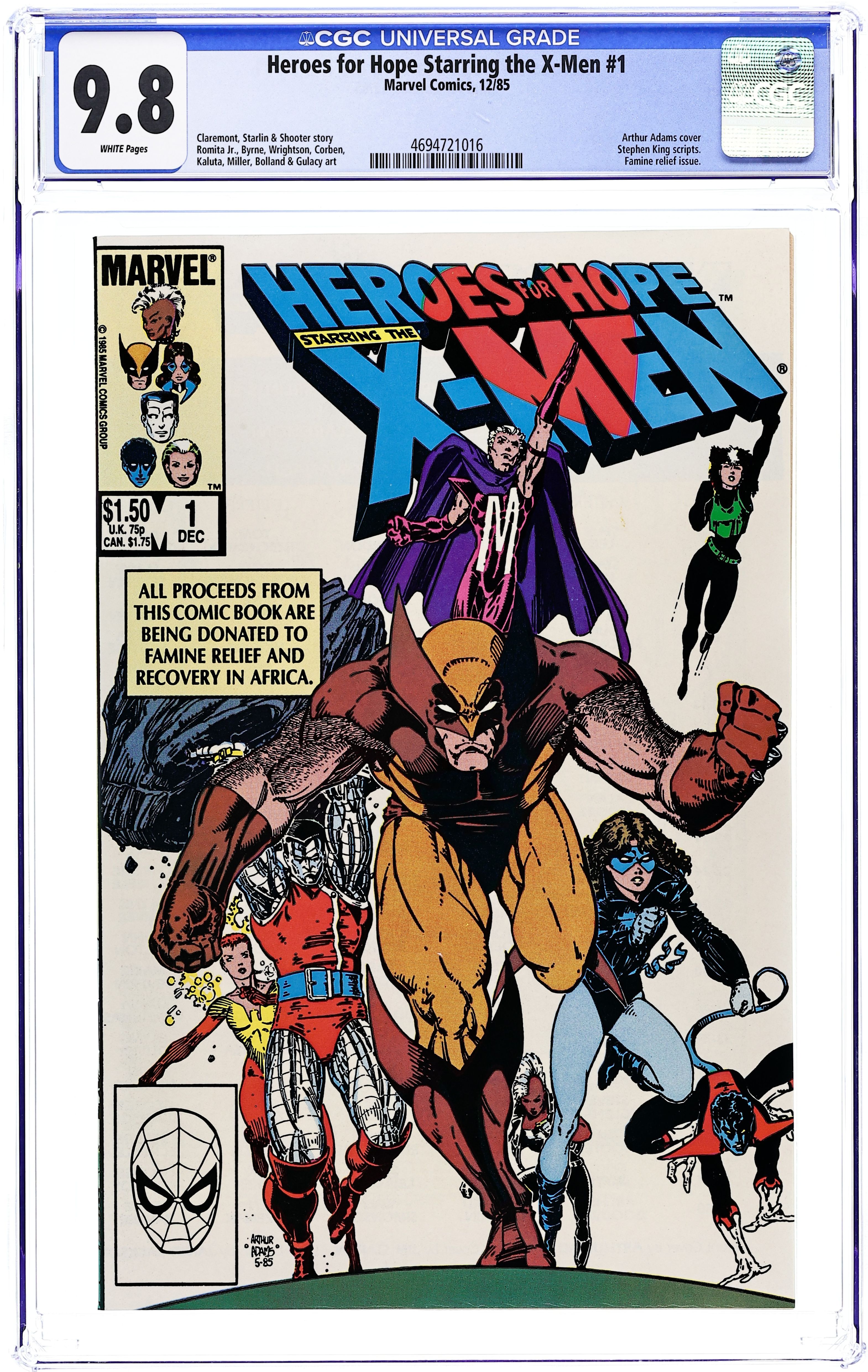 Direct Edition. The X-Men face an entity that feeds on psychic misery in this 'jam' book originally published to benefit famine relief in Africa. Story by Chris Claremont, Ann Nocenti, Bernie Wrightson, Jim Starlin & Jim Shooter. Script by Stan Lee (4 pages), Ed Bryant (3 pages), Louise Simonson (3 pages), Stephen King (3 pages), Bill Mantlo (2 pages), Alan Moore (3 pages), Ann Nocenti (3 pages), Harlan Ellison (3 pages), Chris Claremont (2 pages), Jo Duffy (2 pages), Mike Baron (2 pages), Denny O'Neil (2 pages), George R.R. Martin (3 pages), Bruce Jones (2 pages), Steve Englehart (2 pages), Jim Shooter (2 pages), Mike Grell (3 pages) & Archie Goodwin (4 pages). Art by John Romita, Jr. & Al Gordon (2 pages), John Buscema & Klaus Janson (2 pages), Brent Anderson & Joe Sinnott (1 page), John Byrne & Terry Austin (3 pages), Brent Anderson & Dan Green (1 page), Bernie Wrightson & Jeff Jones (3 pages), Charles Vess & Jay Muth (2 pages), Brent Anderson & Tom Palmer (1 page), Richard Corben (3 pages), Mike Kaluta & Al Milgrom (3 pages), Frank Miller & Bill Sienkiewicz (3 pages), Brian Bolland & Craig Russell (2 pages), John Bolton (2 pages), Steve Rude & Carl Potts (2 pages), Bret Blevins & Al Williamson (2 pages), Herb Trimpe & Sal Buscema (3 pages), Gray Morrow (2 pages), Paul Gulacy & Bob Layton (2 pages), Alan Weiss & Joe Rubinstein (2 pages), Jackson Guice & Steve Leialoha (3 pages), Howard Chaykin & Walt Simonson (4 pages). Front cover by Arthur Adams. Back cover by Jim Starlin. Cover price $1.50.