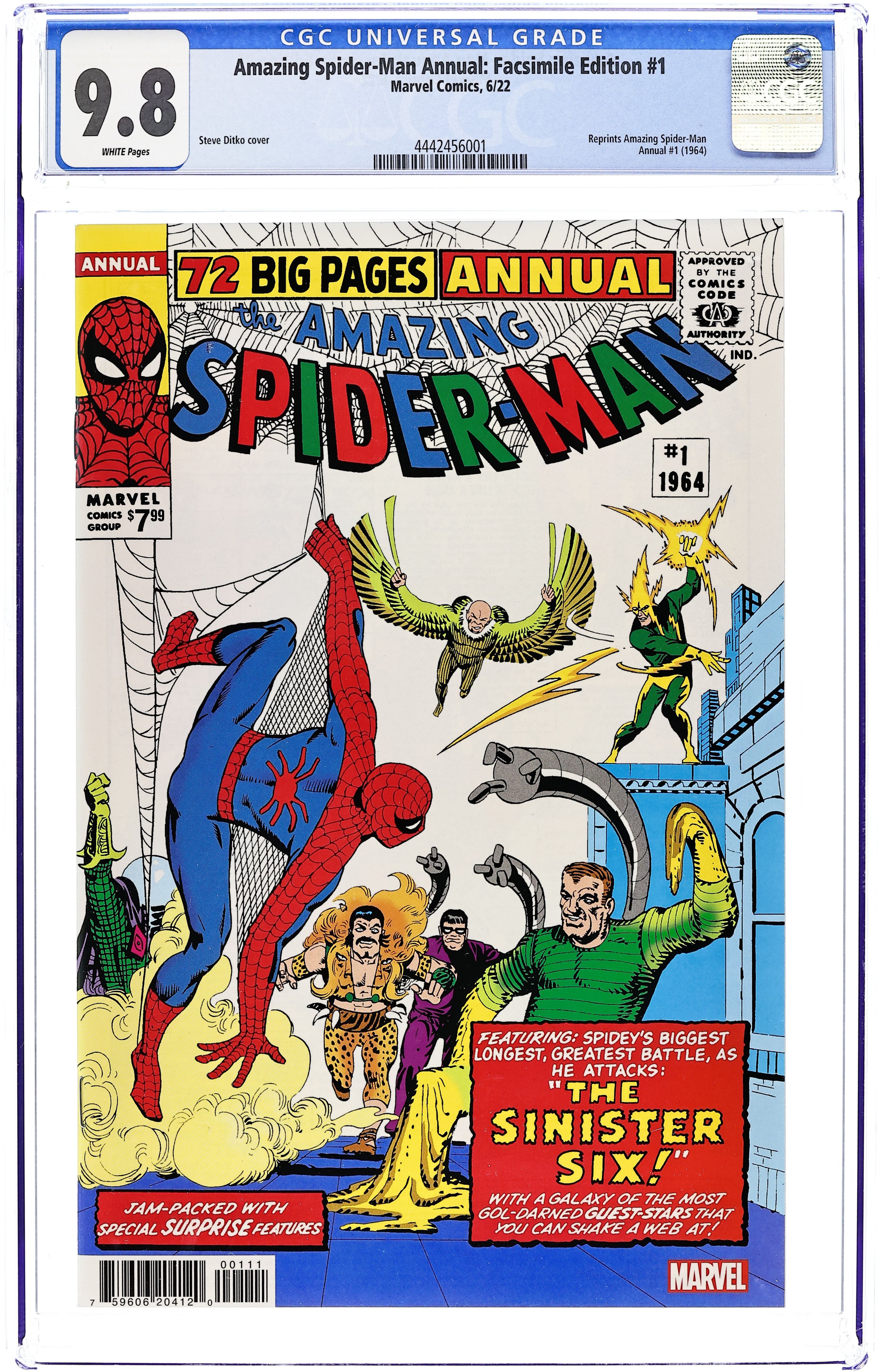 Written by Stan Lee. Art and Cover by Steve Ditko. Doctor Octopus! Electro! Mysterio! The Vulture! Sandman! Kraven the Hunter! Individually, each of these deadly foes tested Spider-Man to his limit during the early years of his web-swinging adventures. So how can Spidey possibly hope to survive when they band together as what can only be called the Sinister Six? Find out in this landmark first-ever Spider-Man Annual from the brilliant minds of Stan Lee and Steve Ditko at the peak of their powers! Peter Parker is in for the fight of his life against a sextet of super villains - and every single battle along the way makes a great, big splash! And don't miss all the inventive extras you'd expect from a classic Marvel Annual! It's one of the all-time great Marvel comic books, boldly re-presented in its original form, ads and all! Reprinting AMAZING SPIDER-MAN ANNUAL (1964) #1. Featuring cameos by the Avengers, Fantastic Four, Doctor Strange, and X-Men! 72 pages, full color. Cover price $7.99.