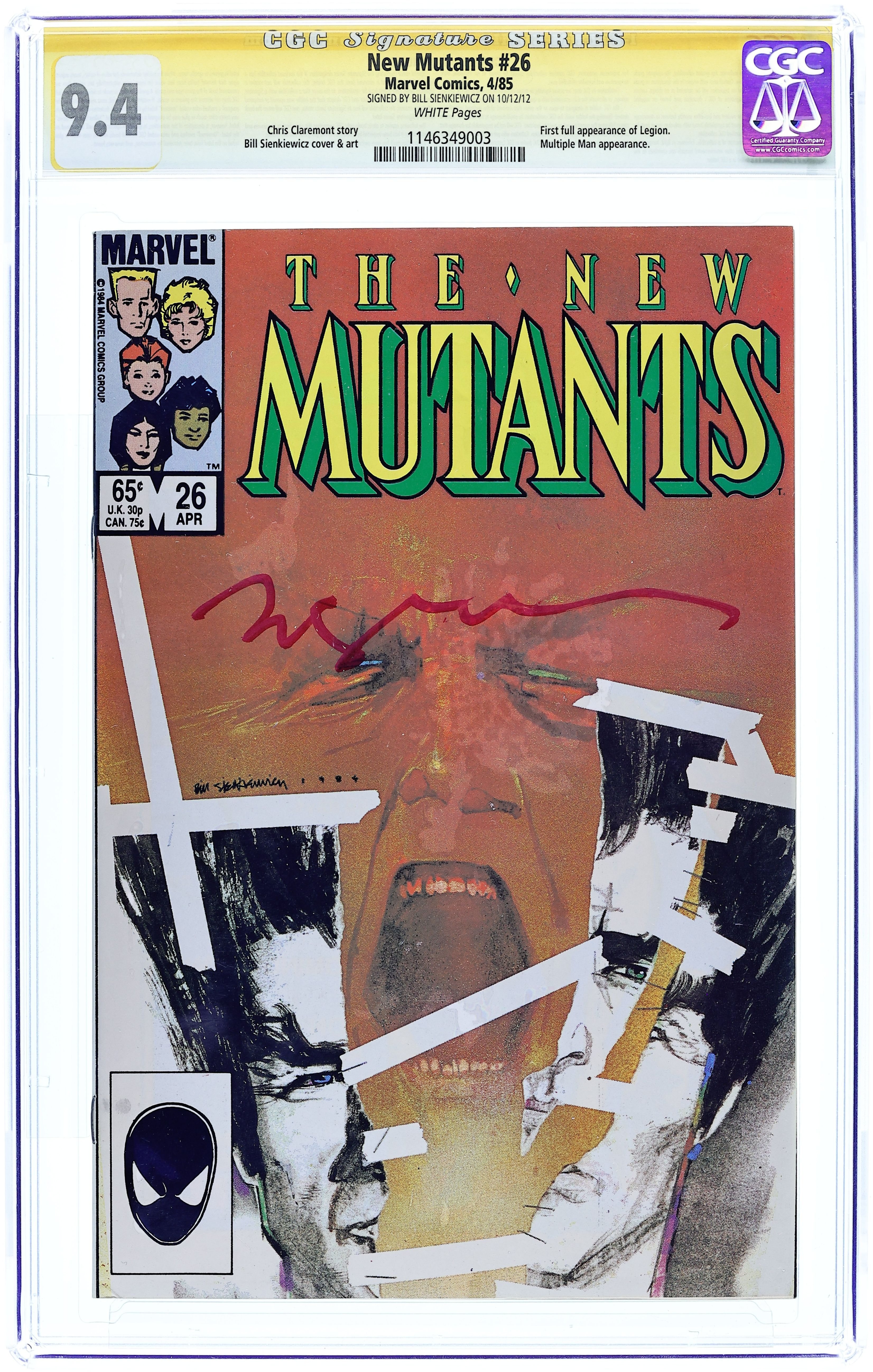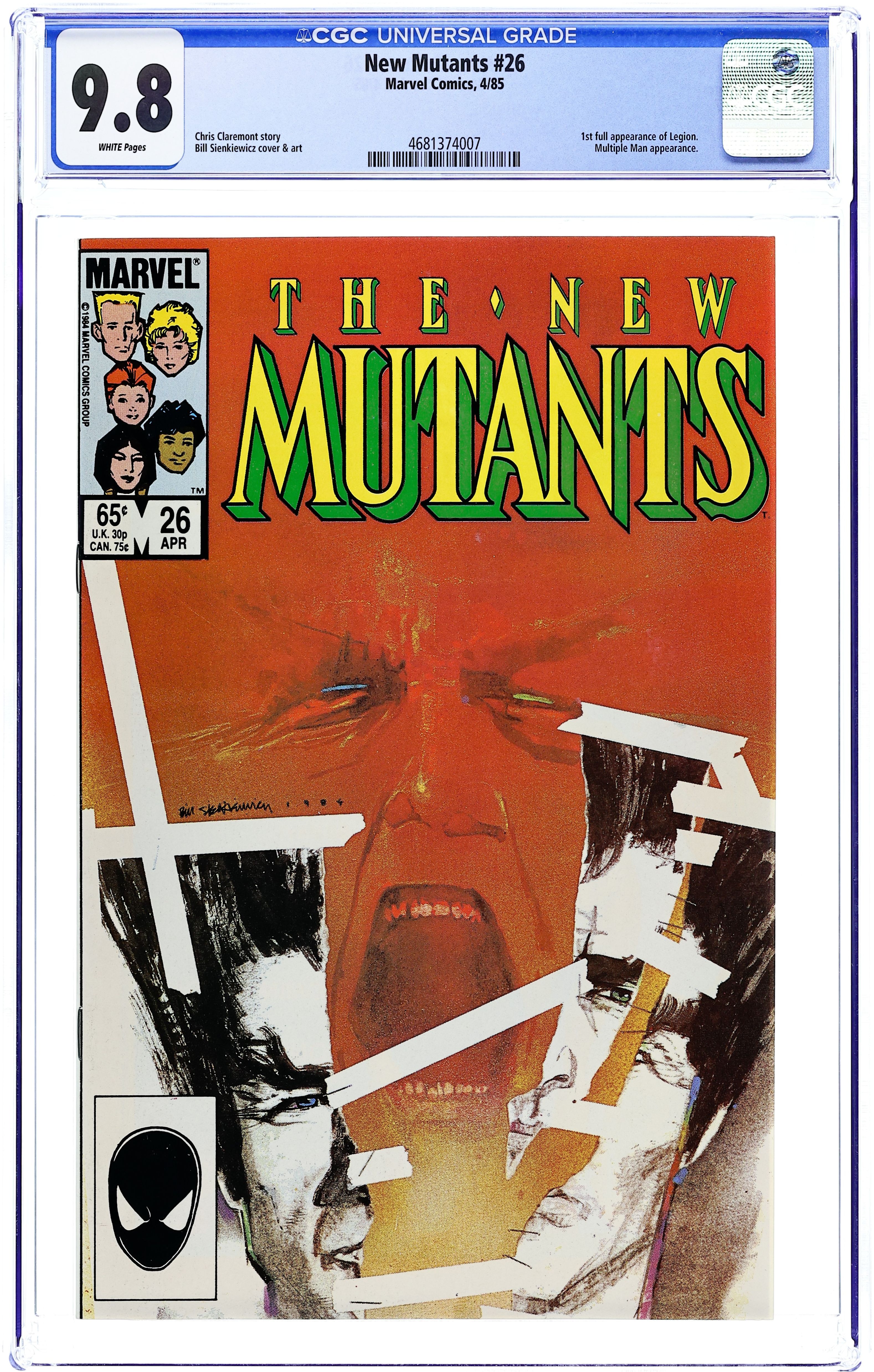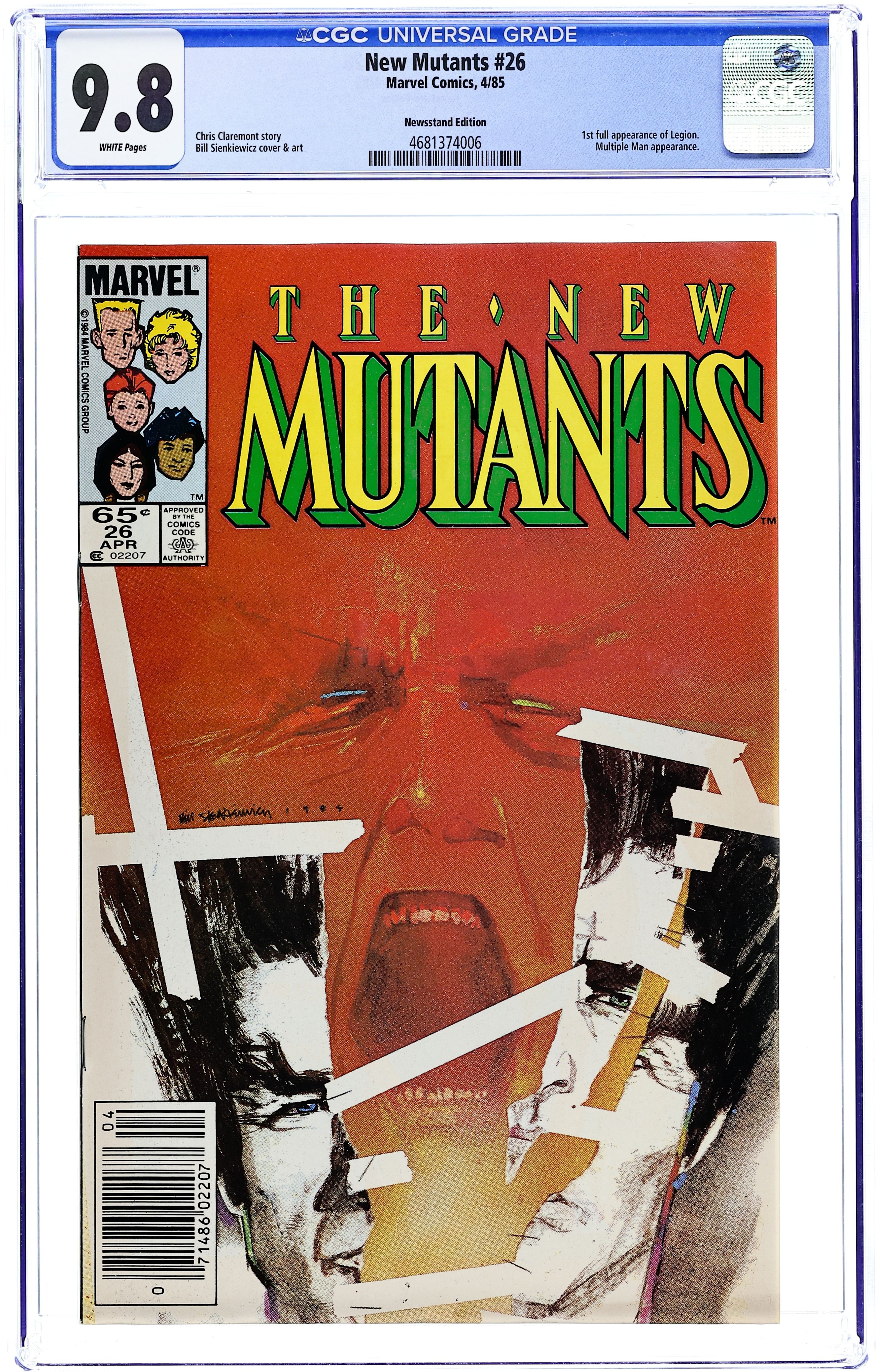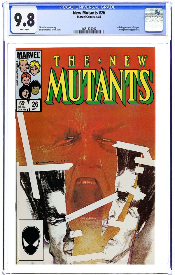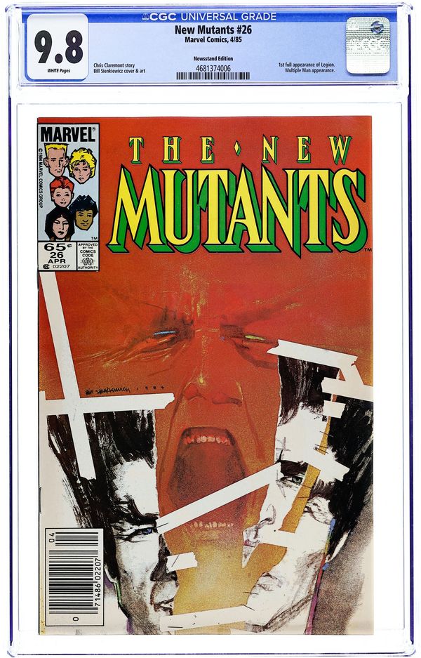 Newsstand Edition. First 65-cent cover price issue. 1st full appearance of Legion. Cover art by Bill Sienkiewicz. Legion, script by Chris Claremont, art by Bill Sienkiewicz; Gabrielle Haller's autistic son begins exhibiting telepathic, telekinetic, and pyrotic powers; Prof. X and the New Mutants come to help; Wolfsbane encounters Rev. Craig again; Emma Frost gives Empath an ultimatum; Magneto and Aleytys begin a relationship. 36 pgs. $0.65. Cover price $0.65.