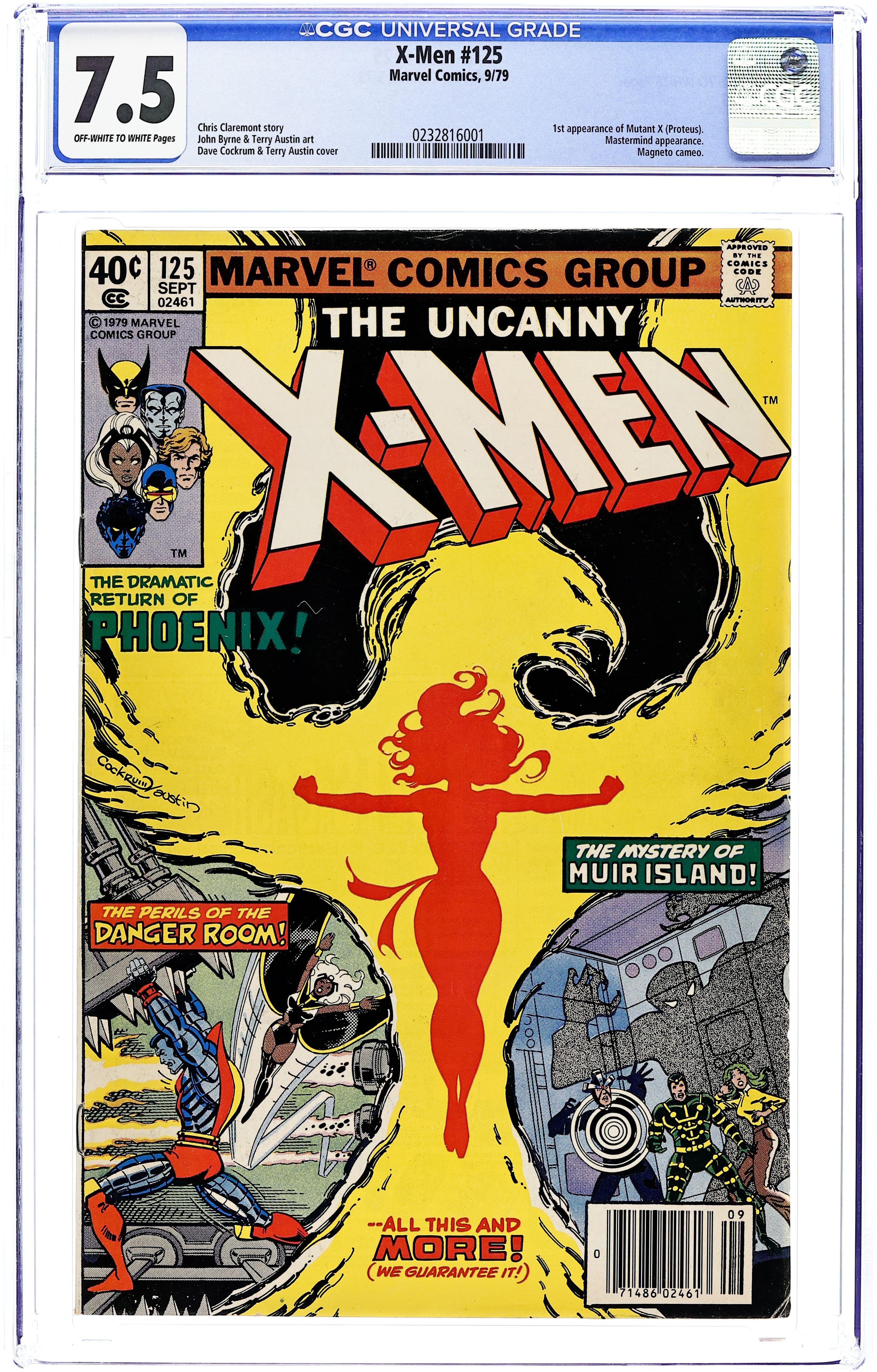 Newsstand Edition. As the cover says: the dramatic return of Phoenix! "There's Something Awful on Muir Island!" "...!" Story by Chris Claremont and John Byrne. Art by John Byrne and Terry Austin. First appearance of Mutant X (Proteus). Cover price $0.40.