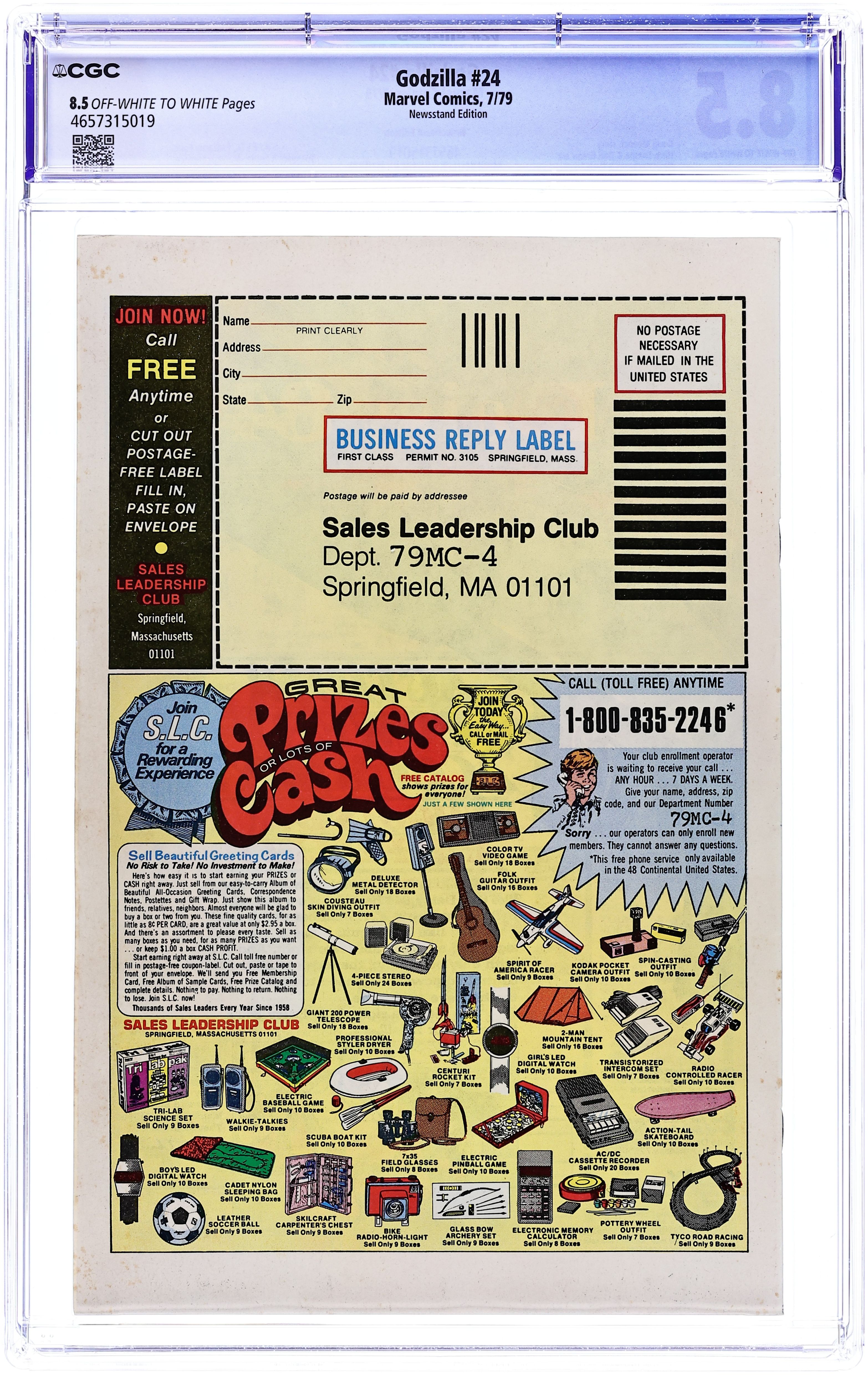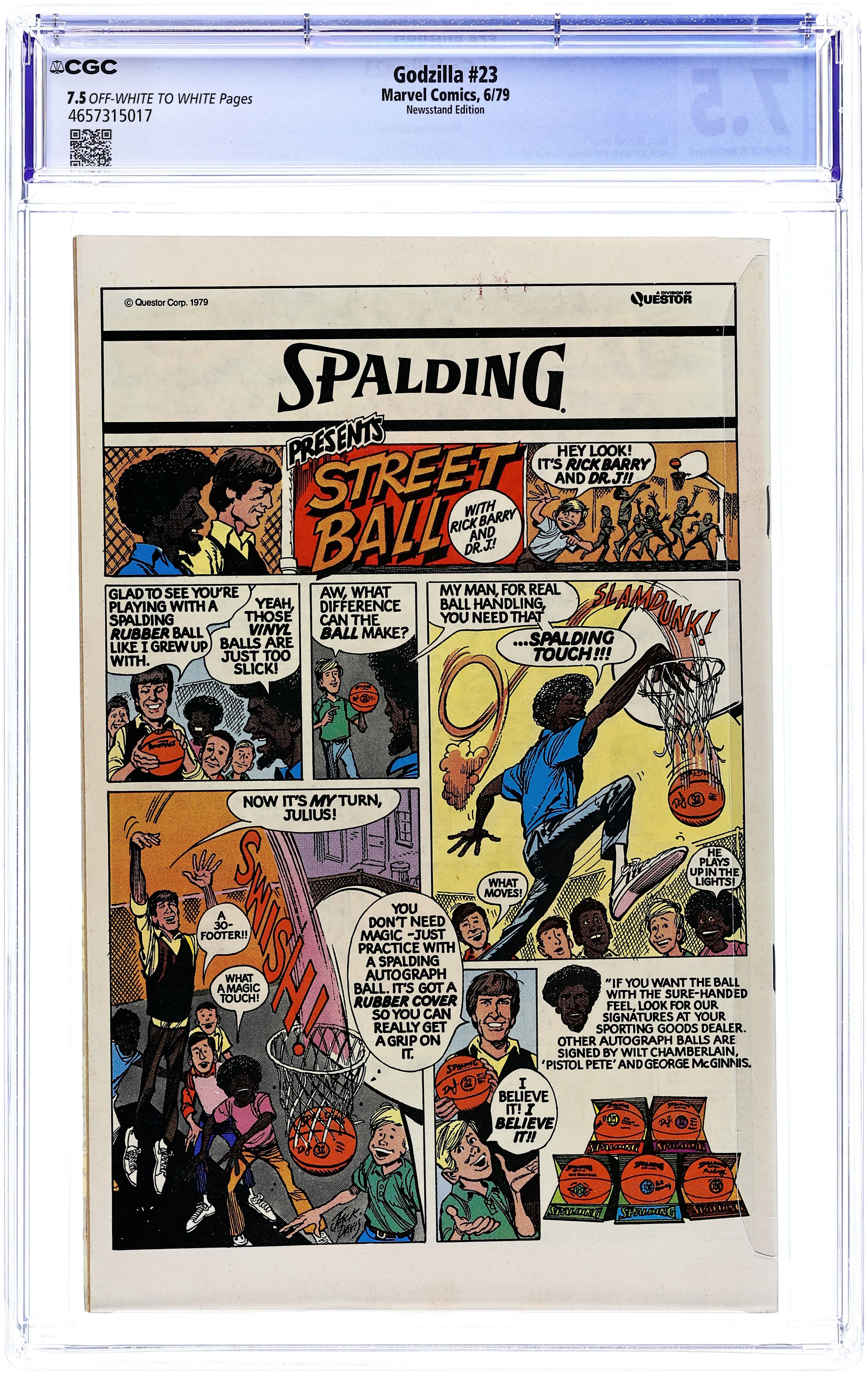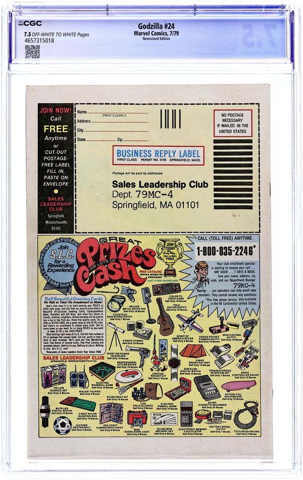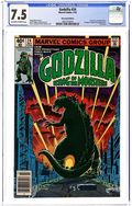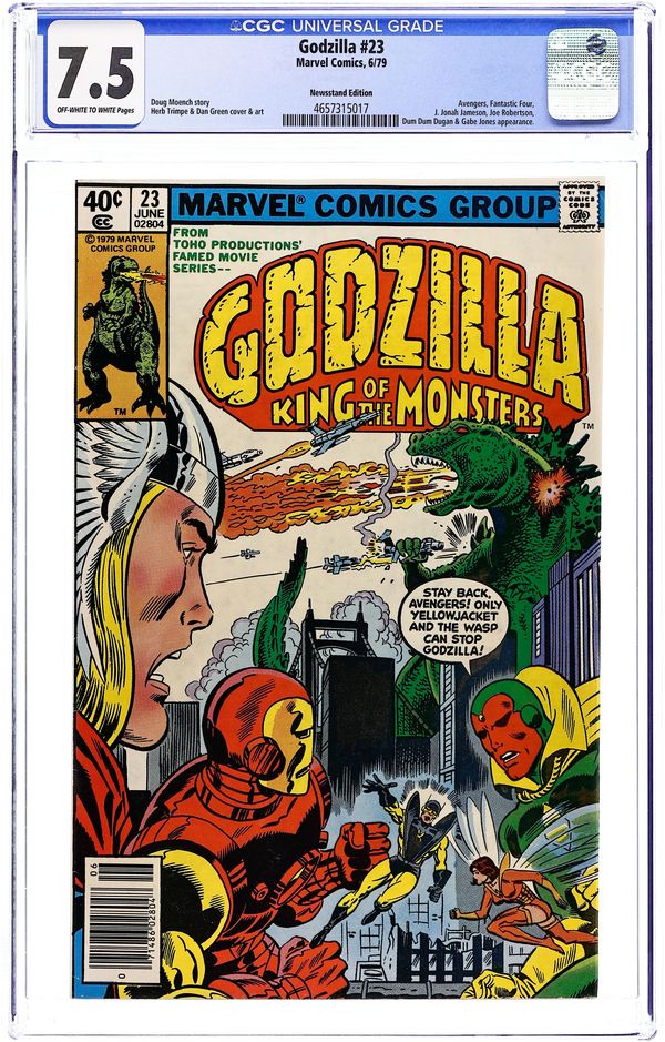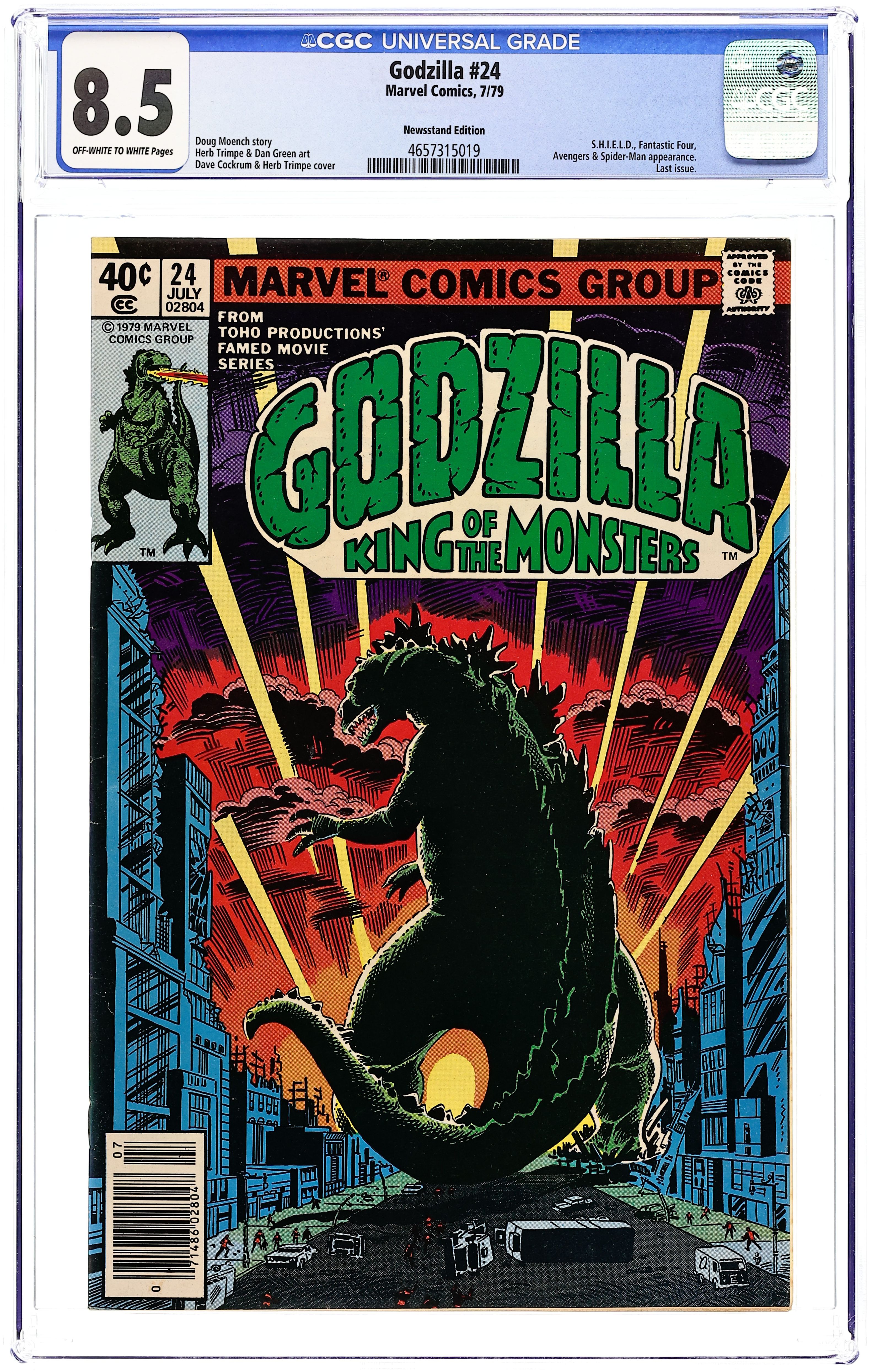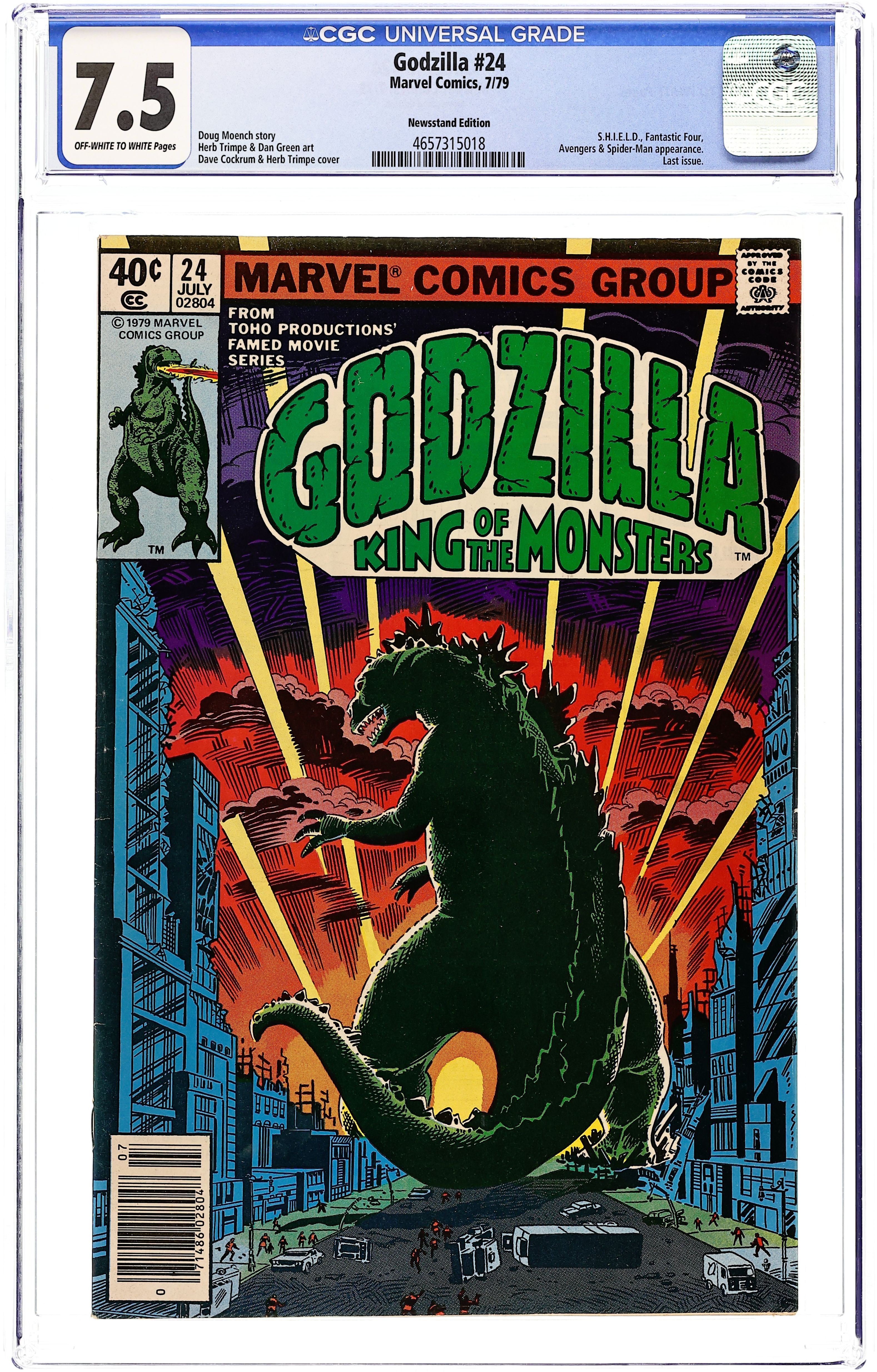 Newsstand Edition. Final issue. "And Lo, A Child Shall Lead Them!" Part 8 of 8. Guest-starring the Avengers and Fantastic Four. Spider-Man cameo. Story by Doug Moench. Art by Herb Trimpe and Dan Green. Godzilla's epic American Tour comes to an earth shattering end. Can the combined might of the Avengers, Fantastic Four, and S.H.I.E.L.D. hope to contain this titanic beast before he destroys the Big Apple, or will they have to finally use lethal force to bring the beast down? This is it, the final farewell for Godzilla, King of the Monsters. Cover price $0.40.