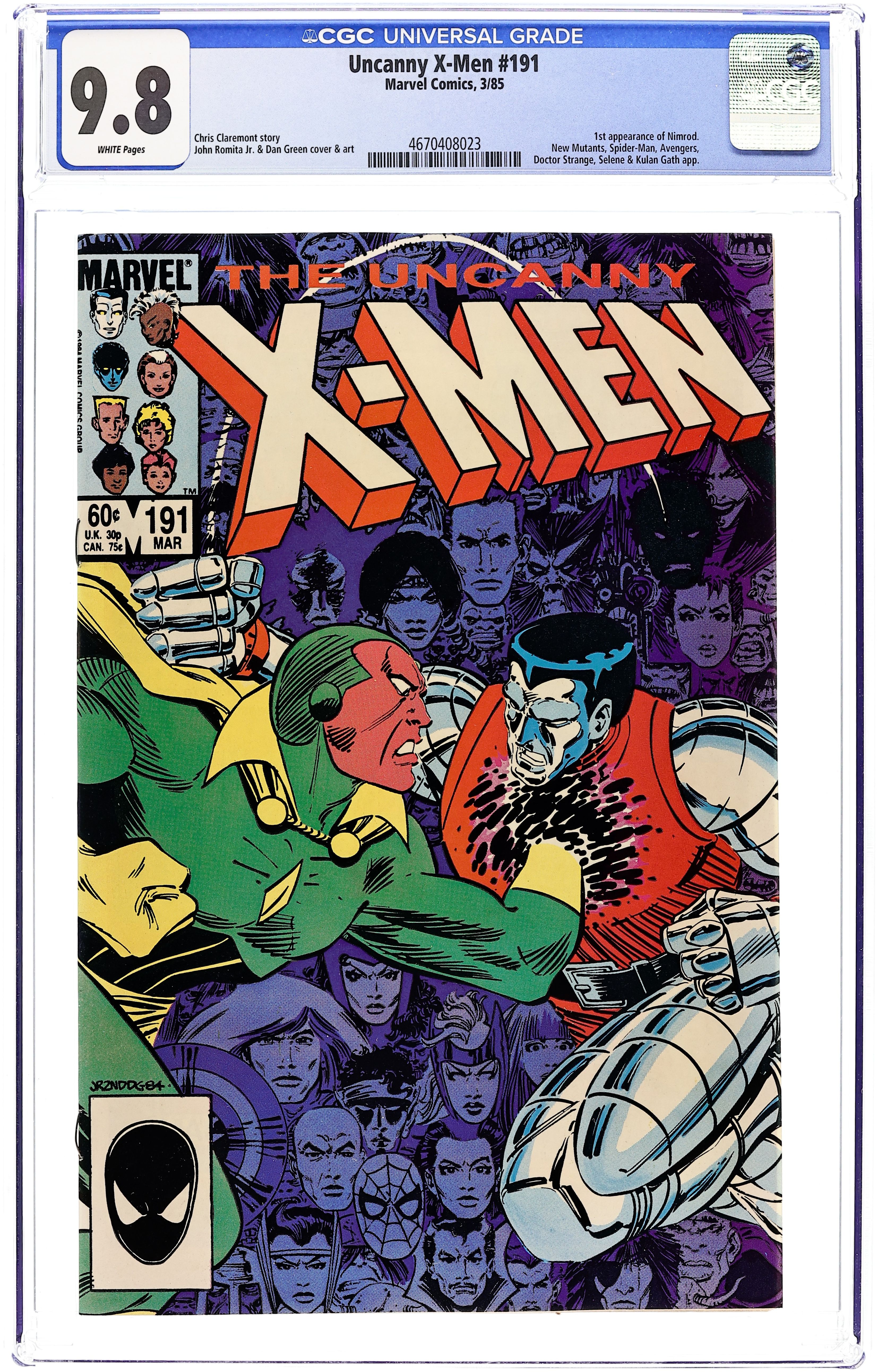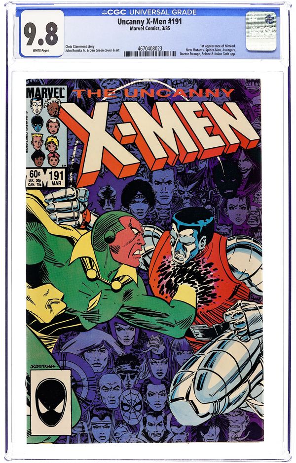 Direct Edition. "Raiders of the Lost Temple!" Part 2 of 2. Guest-starring the Avengers, the New Mutants, Doctor Strange, and Spider-Man. Story by Chris Claremont. Art by John Romita, Jr. and Dan Green. The X-Men, Avengers, and New Mutants must unite and defeat some of their own to stop the sinister warlock Kulan Gath before his dark magic encompasses the Earth, turning everything into a fantasy world of sword and sorcery. The key to victory lies with the man known as the Spider! Plus, a mysterious new threat arrives from the future. NOTE: 1st appearance of Nimrod. 36 pgs. Cover price $0.60.