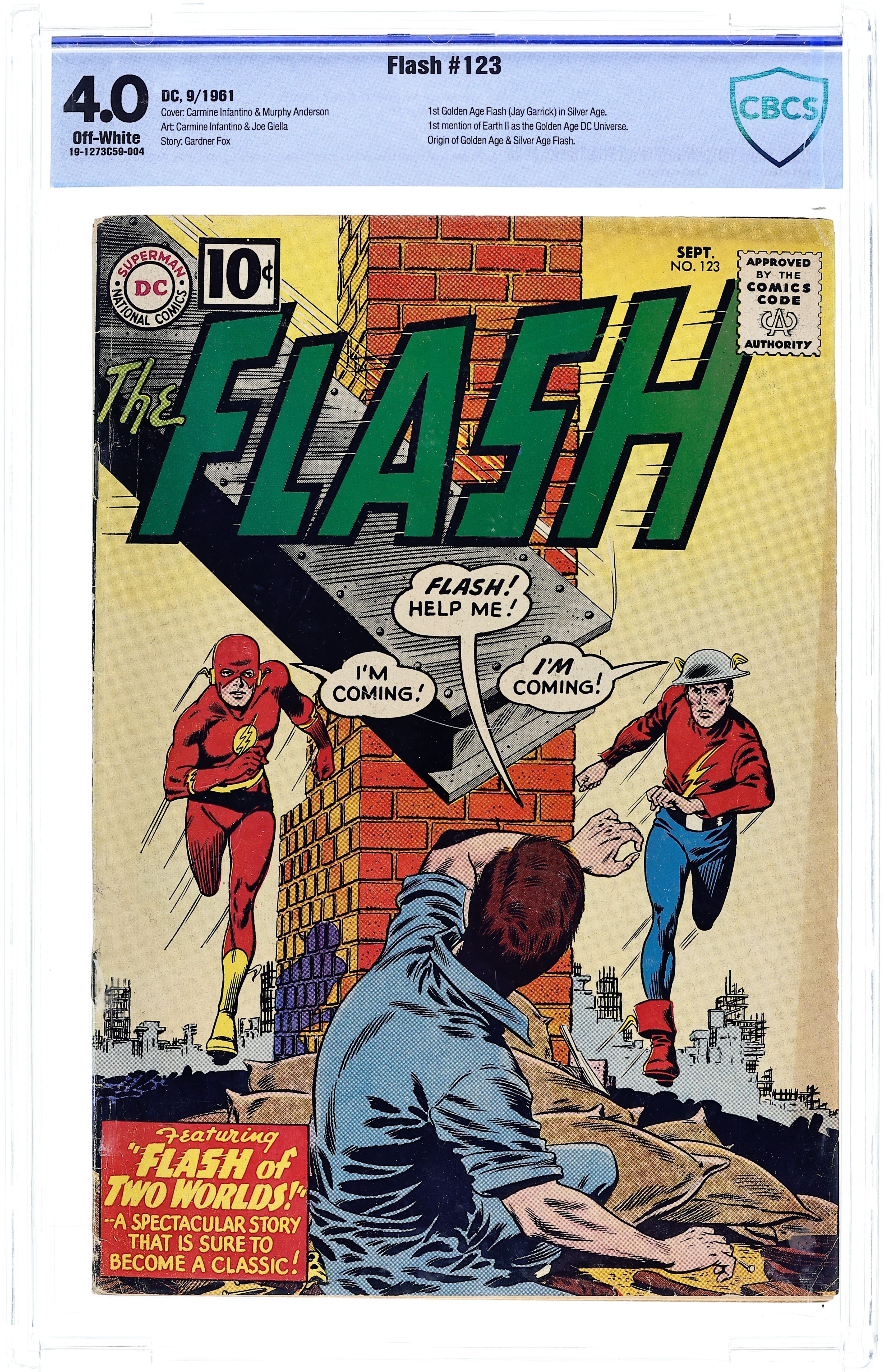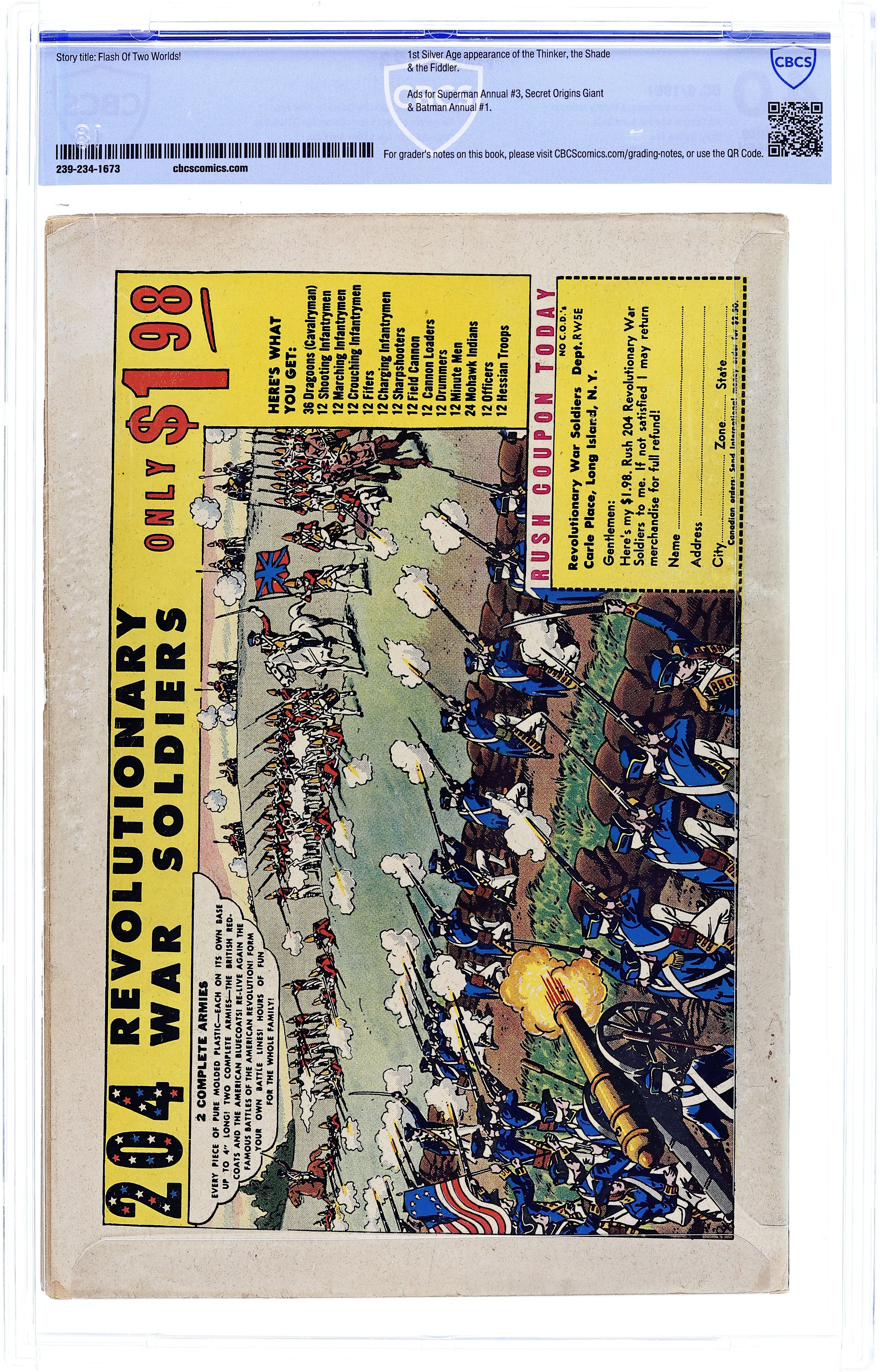 Cover pencils by Carmine Infantino, inks by Murphy Anderson. 1st Silver Age appearance of Golden Age Flash; 1st mention of an Earth-2 where Golden Age heroes live. Flash of Two Worlds!, script by Gardner F. Fox, pencils by Carmine Infantino, inks by Joe Giella; Barry Allen appears at the Community Center in Central City to perform for kids, and during one of his amazing tricks, is mysteriously transported to Keystone City, a place that he recalls that the original Flash once lived; The two meet and Barry surmises that Jay lives on a parallel Earth, one that evidently Earth-1 writer Gardner Fox tuned in on when he wrote the adventures of the Flash in the 1940's; Jay tells Barry that a crime wave has hit Keystone City and asks Barry for his help. Fastest Trips Around The World! fact page. Promo for Superman Annual #3 and Secret Origins #1. Promo for Batman Annual #1, pencils by Curt Swan, Sheldon Moldoff, and Dick Sprang, inks by Charles Paris. Palisades Amusement Park ad with Superman. 36 Pages, Full Color. Cover price $0.10.