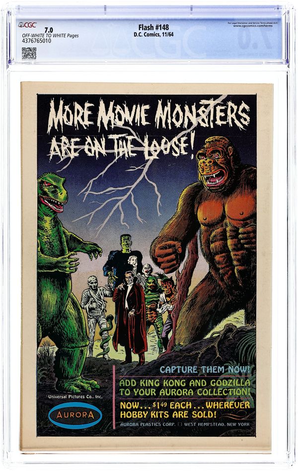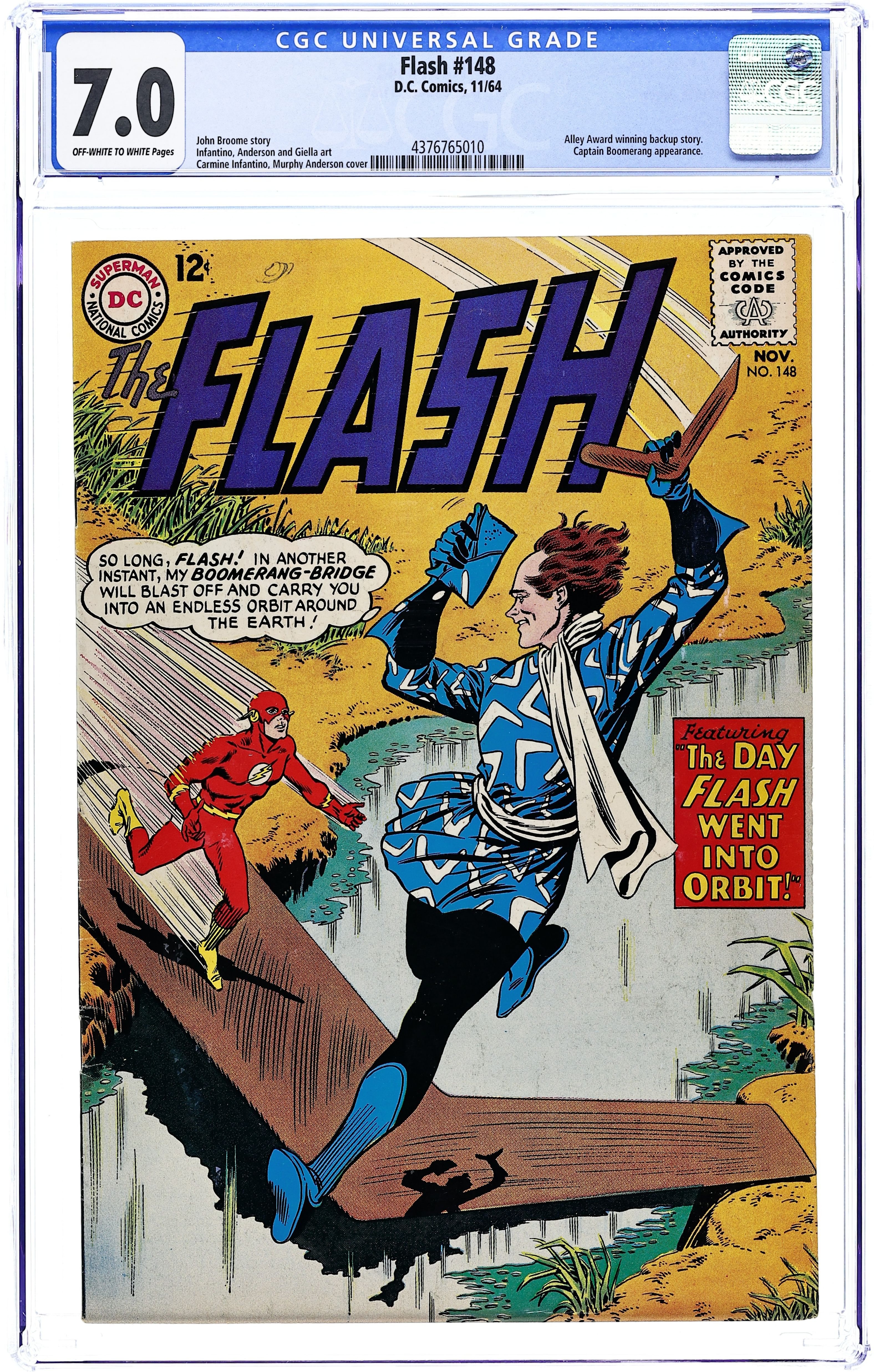 Cover pencils by Carmine Infantino, inks by Murphy Anderson. The Day Flash Went Into Orbit, script by John Broome, pencils by Carmine Infantino, inks by Murphy Anderson; Capt Boomerang tries to send Flash off into space on a giant boomerang...again. The Doorway to the Unknown, script by John Broome, pencils by Carmine Infantino, inks by Joe Giella; an offbeat story involving a call from beyond death, a classic tale of redemption and "the invincible spirit of man." Rocky and Bullwinkle star in a one-page Cheerios ad. 80 Page Giant Flash ad. Flash subscription ad. Trix cereal ad. Solar System Speeds! fact page. Aurora movie monsters model kits back-cover ad. 36 Pages, Full Color. Cover price $0.12.