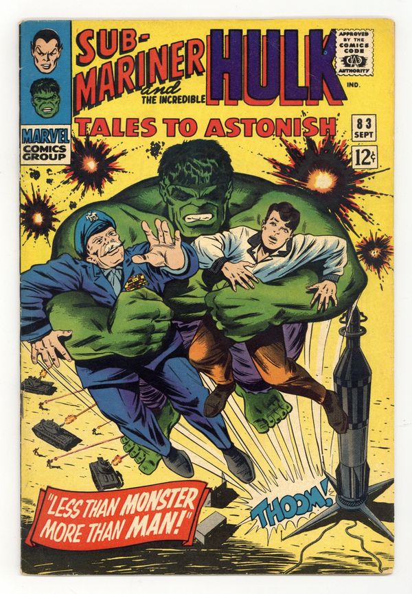 Starts Mar 16 Cover by Bill Everett. The Sub-Mariner Strikes!, script by Stan Lee, art by Jack Kirby and Dick Ayers; Sub-Mariner and Krang battle over New York. When Sub-Mariner loses his memory at the end of the battle the Secret Empire convinces him that they are his friends. Less than Monster, More Than Man!, script by Stan Lee, art by Jack Kirby and Bill Everett; The Hulk has saved Betty from the Boomerang but Ross thinks he has kidnapped his daughter so he sends the whole force of gamma base after the jade giant; While the miltary is distracted with their Hulk hunt, Boomerang tries once again to capture the Orion missile. 36 pgs., full color. $0.12. Cover price $0.12.