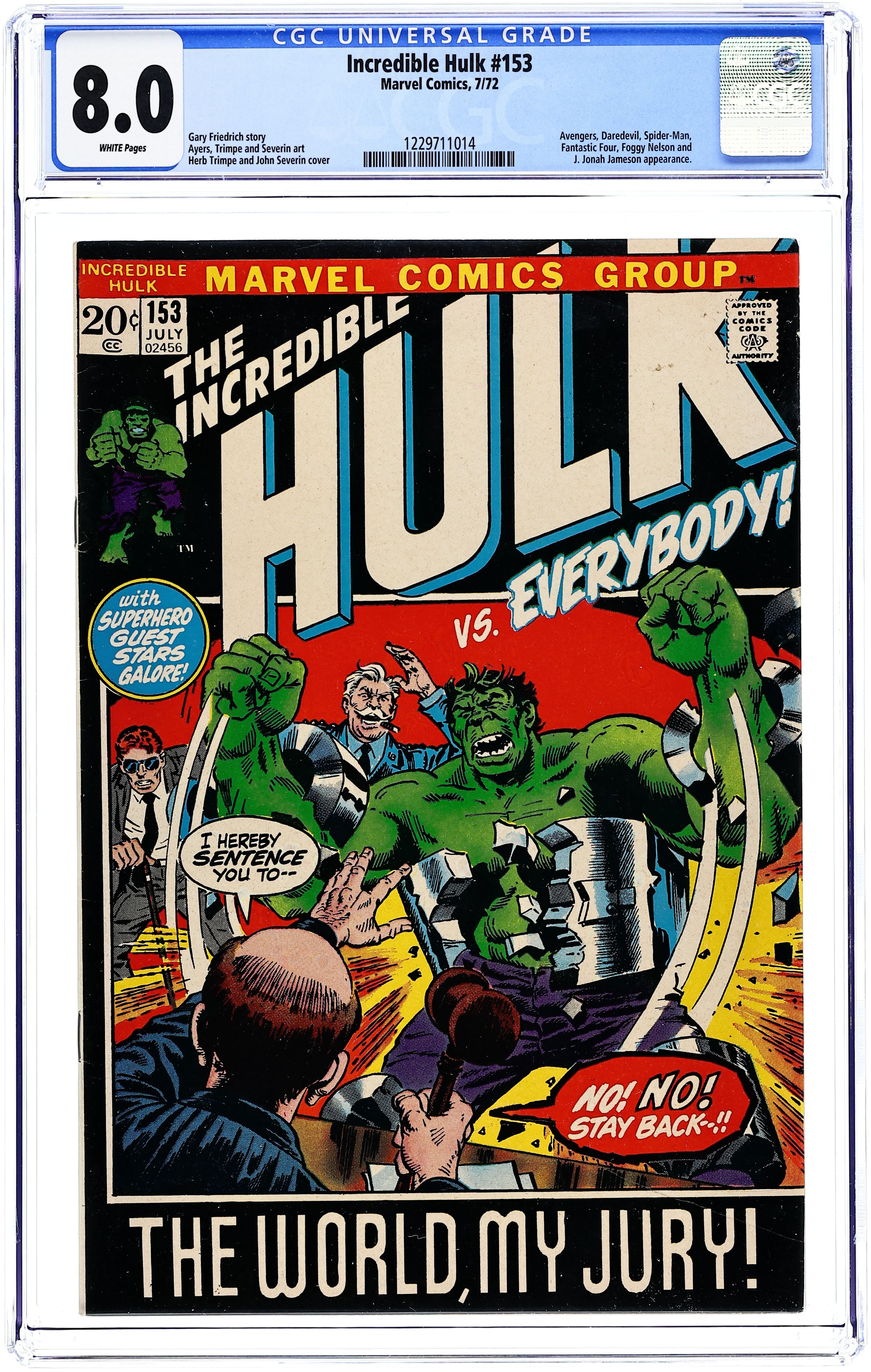 Cover pencils by Herb Trimpe, inks by John Severin. The World, My Jury!, script by Roy Thomas and Gary Friedrich, pencils by Dick Ayers (pages 1-17) and Herb Trimpe (pages 18-21 and Avengers and Iron-Man figures on pages 15-16), inks by John Severin; On a runway at JFK airport, Mr. Fantastic brings the Hulk down with his newly devised Nega-Gamma Gun; The Hulk is placed in heavy restraints and is put on trial for his crimes; After testimony in the case, both pro and con, Matt pulls a stunt out of his lawyer's bag of tricks and quickly proves that the Hulk is too mentally incompetent to stand trial; As the judge tries to figure out how to proceed, Reed shows up with his special gun and claims it will change the Hulk into Bruce Banner for good; Instead, it provides the Hulk with the strength to break free and escape. Letter from comics writer Mike W. Barr. 36 pgs. $0.20. Cover price $0.20.