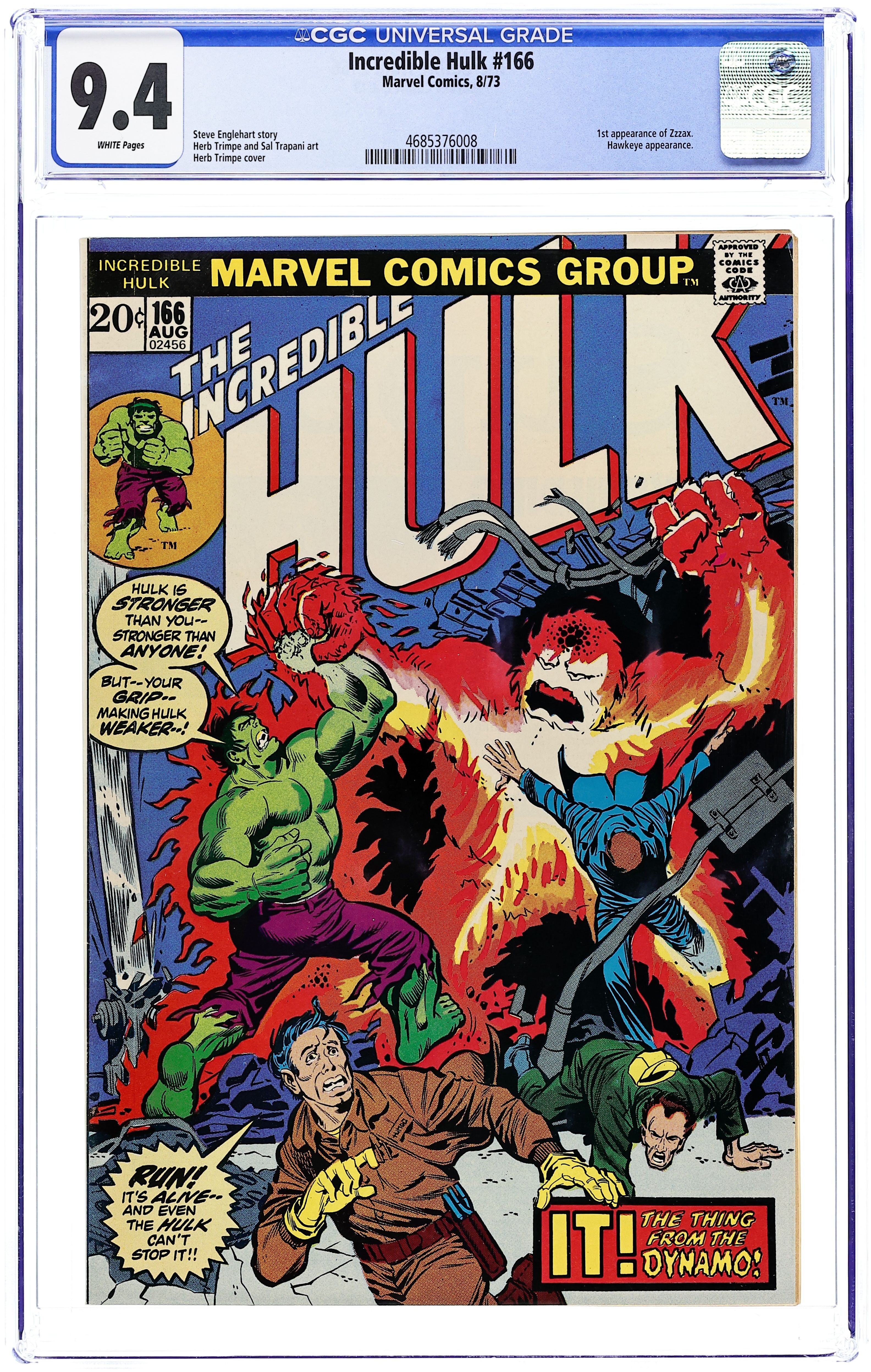 Cover art by Herb Trimpe. The Destroyer From the Dynamo!, script by Steve Englehart, pencils by Herb Trimpe, inks by Sal Trapani; Hulk swims ashore in New York City just in time to assist Hawkeye in taking on the electrical menace of Zzzax; Meanwhile, in Russia, Talbot and his forces successfully rescue Thunderbolt Ross from his captors but Talbot ends up getting captured himself. The story continues from Avengers 109 and continues into Defenders 7. 36 pgs. $0.20. Cover price $0.20.