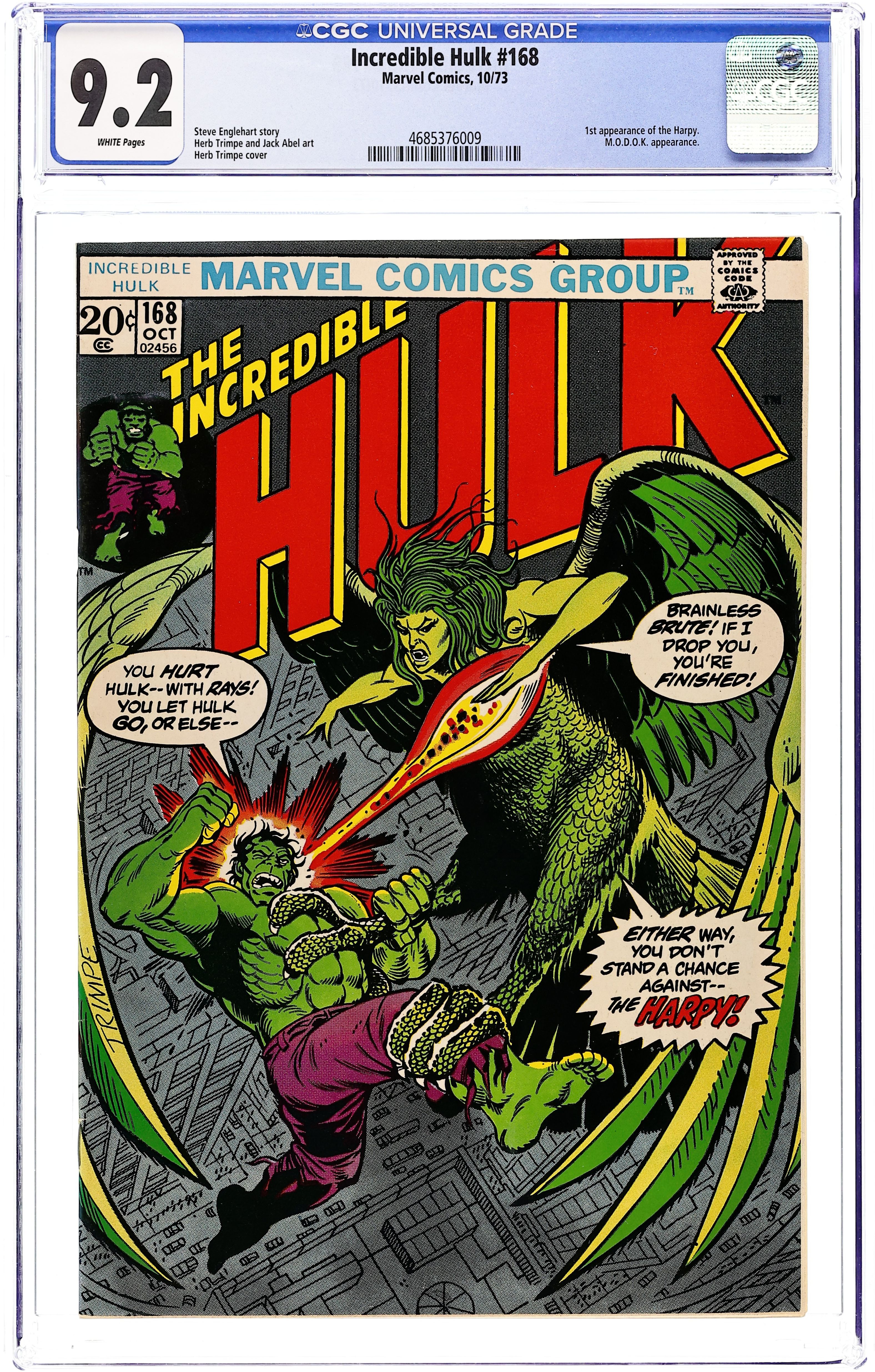Cover art by Herb Trimpe. The Hate of the Harpy!, script by Steve Englehart, pencils by Herb Trimpe, inks by Jack Abel; M.O.D.O.K. exposes Betty to a heavy dose of gamma radiation and turns her into the Harpy; Lashing out at the jade giant for having a hand in her husband's death, the Harpy takes down the Hulk by playing on his sympathies and then blasting him; Meanwhile, officials at the Pentagon relieve Thunderbolt Ross of his duties and place Colonel Armbruster in charge of Project Greenskin. 36 pgs. $0.20. Cover price $0.20.