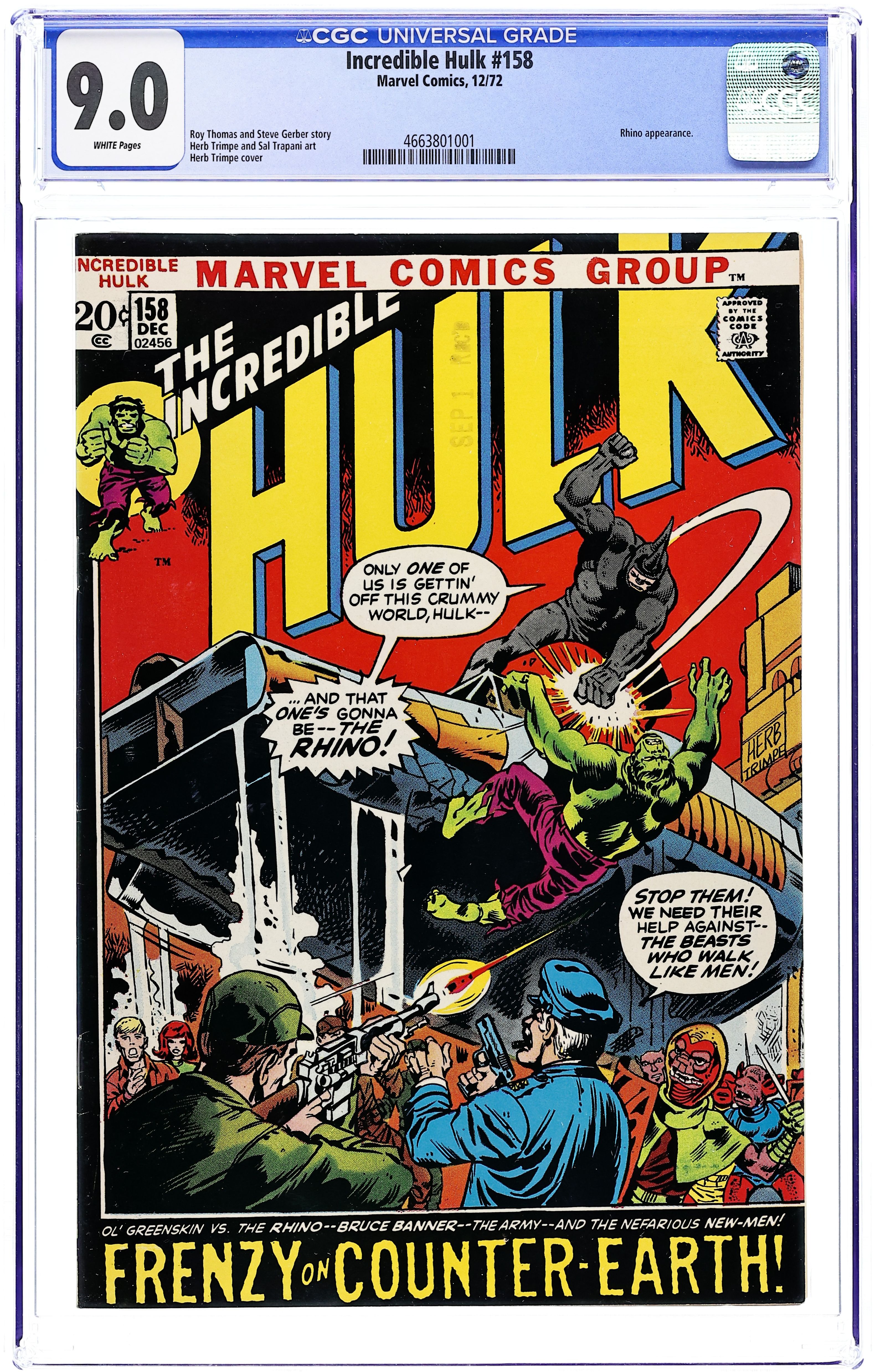 Cover art by Herb Trimpe. Frenzy On a Far-Away World!, script by Roy Thomas and Steve Gerber, pencils by Herb Trimpe, inks by Sal Trapani; While Hulk takes a trip to Counter-Earth where he battles the Rhino, gets involved in a New Men civil war and meets his counter alter ego (Bruce, his wife Betty and their son Bobby), back on his own Earth, Betty Ross and Glenn Talbot are busy getting married. 36 pgs. $0.20. Cover price $0.20.
