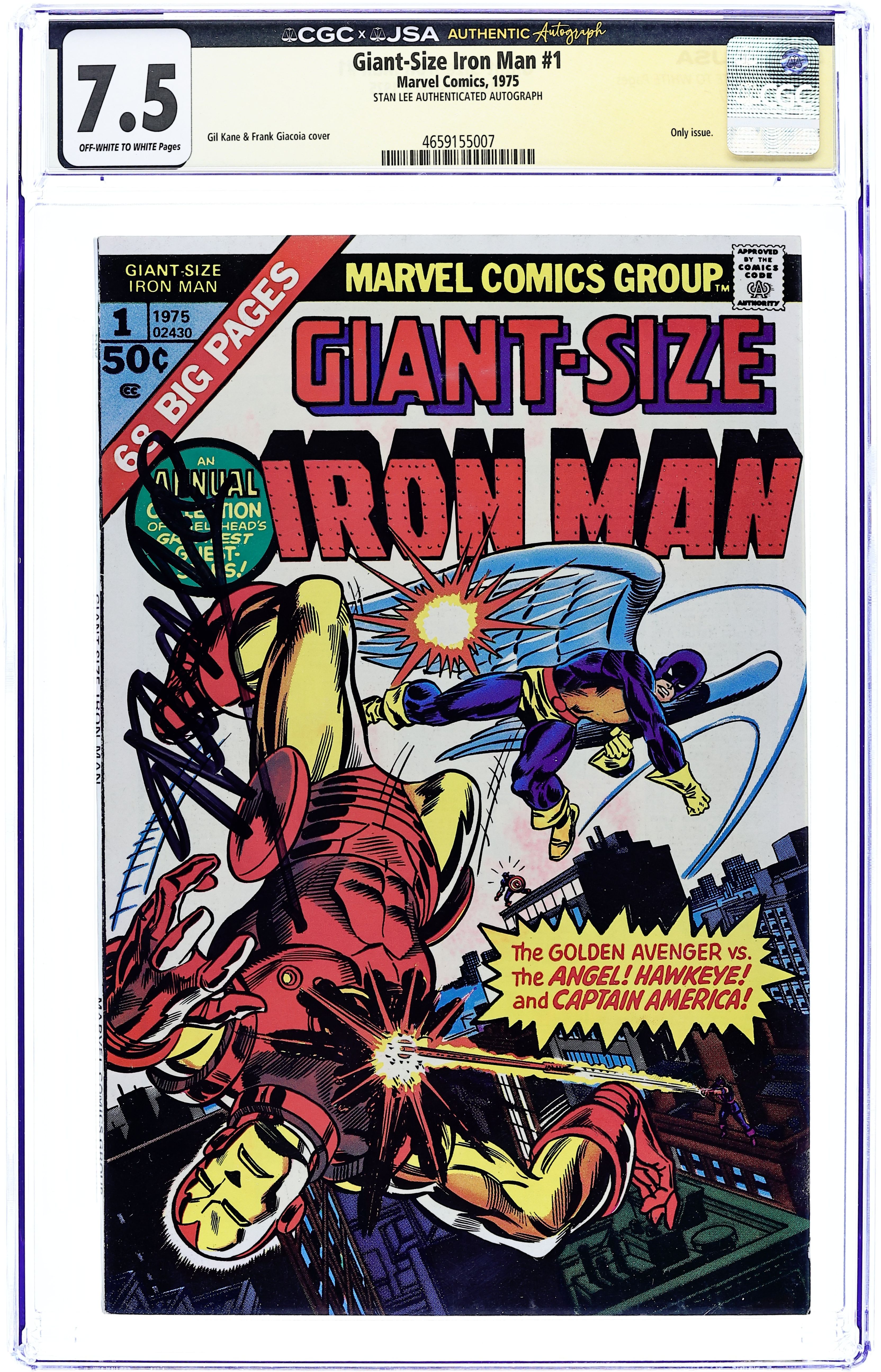 This giant-size issue features three reprint stories and a new cover by Gil Kane and Frank Giacoia. First story reprinted from Tales of Suspense 49 (minus 3 pages): "The New Iron Man Meets the Angel!" Guest-starring the original X-Men. Script by Stan Lee. Pencils by Steve Ditko. Inks by Paul Reinman. The Angel is caught in the blast of an atomic explosion at Stark Industries! And now the disoriented Angel wants to leave the X-Men and join the evil mutants instead! It's up to Shell-head to convince him to change his mind! Cameo appearance by the original Avengers. Second story reprinted from Tales of Suspense 57: "Hawkeye, the Marksman!" Guest-starring Hawkeye (first appearance) and the Black Widow. Script by Stan Lee. Art by Don Heck. Iron Man battles the future ace archer of the Avengers: Hawkeye! Third story reprinted from Tales of Suspense 58: "In Mortal Combat with Captain America!" Guest-starring Captain America. Script by Stan Lee. Pencils by Don Heck. Inks by Dick Ayers. The Chameleon tricks Cap and the golden avenger into fighting one another! Cameo appearances by Kraven the Hunter, Giant-Man, and the Wasp. 64 pages. 50 cent cover price. Cover price $0.50.