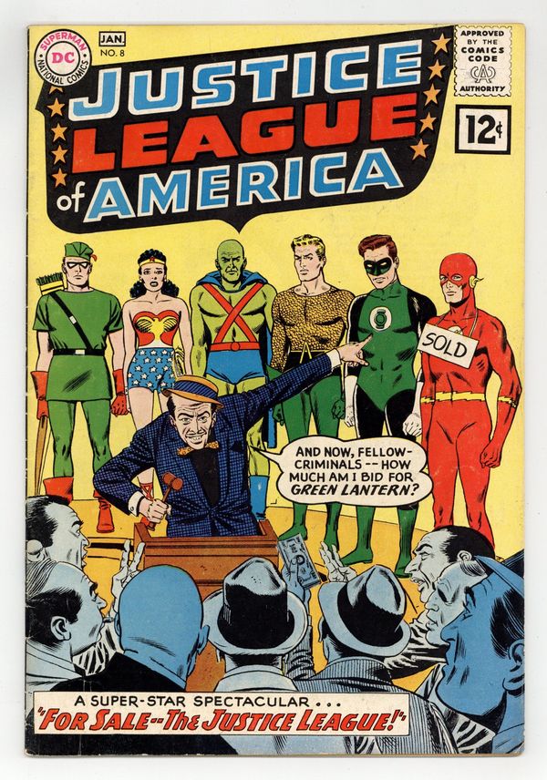 Starts Jan 26 Cover pencils by Mike Sekowsky, inks by Murphy Anderson. For Sale--The Justice League!, script by Gardner Fox, pencils by Mike Sekowsky, inks by Bernard Sachs; While Superman and Batman are away in Dimension X, small-time gangster Pete Ricketts finds a strange ray that he uses to turn the Justice League into a gang of mind-controlled criminals that he auctions off to the highest bidder. 36 pgs. $0.12. Cover price $0.12.