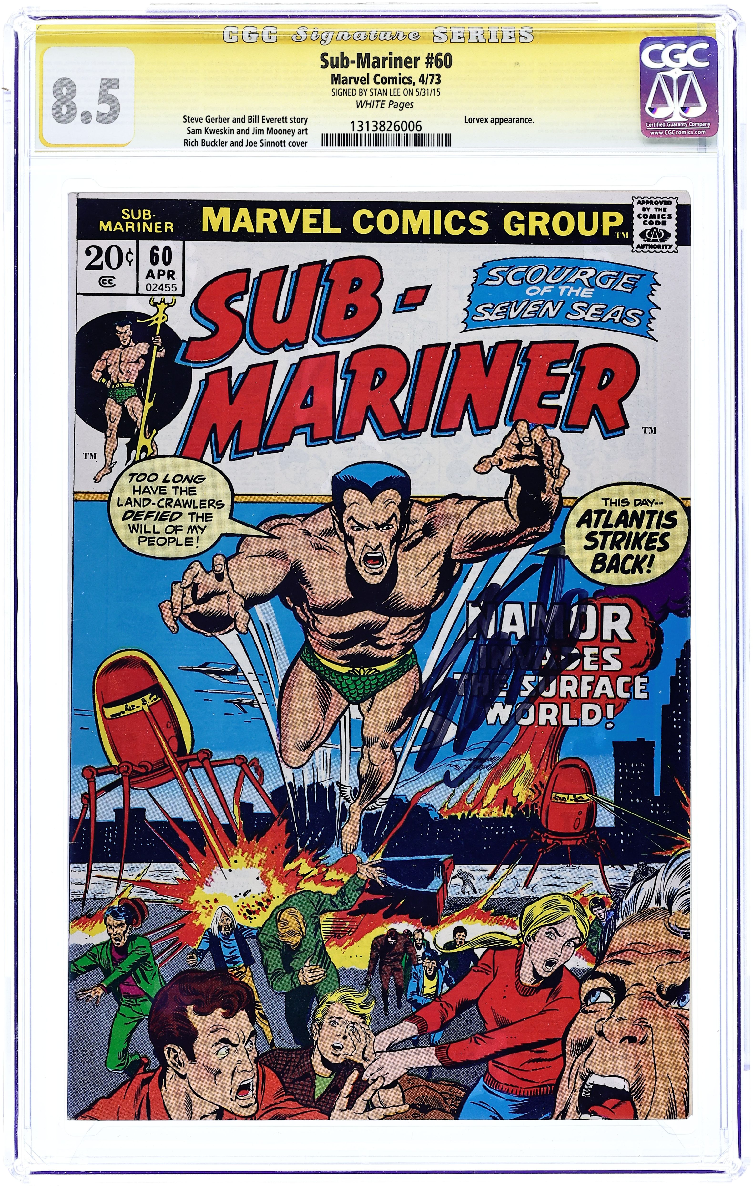 Cover pencils by Rich Buckler, inks by Joe Sinnott. "The Invasion of New York!", script by Bill Everett (plot) and Steve Gerber (script), pencils by Sam Kweskin (layouts) and Jim Mooney (finished art), inks by Jim Mooney; Namor puts his trust in Lorvex to assemble a force which Namor will led against the surface dwellers to free Tamara; The invasion is a success in providing a daunting show of force, but Namor is unable to find Tamara as she has been rescued by Lorvex who decides to keep her as a hostage and continue the onslaught against the surface world; He defeats Lorvex and rescues Tamara; He then calls off the surface attack and after addressing the UN returns to his undersea realm; The surface world does not launch a counter offensive and Namor is once again crowned Prince of Atlantis. 36 pgs., full color. $0.20. Cover price $0.20.