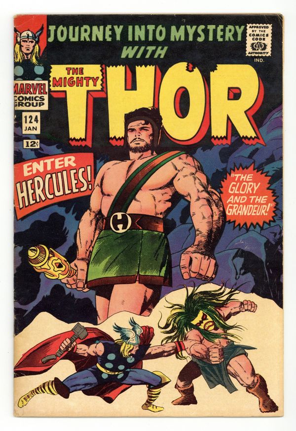 Starts Jan 3 Cover pencils by Jack Kirby, inks by Vince Colletta. First appearance of Atlas in "The Grandeur and the Glory!", script by Stan Lee, pencils by Jack Kirby, inks by Vince Colletta; Thor learns of a "demon" terrorizing the jungles of Asia; Donald Blake reveals his secret to Jane, infuriating Odin; And, Zeus dispatches Hercules to Earth to deal with the native turned "Demon." Tale of Asgard: "Closer Comes the Swarm!", script by Stan Lee, pencils by Jack Kirby, inks by Vince Colletta; While the Asgardians are licking their wounds after a battle with a dragon, Queen Ula sends out the Flying Trolls of Thryheim to finish them off. Appearances by Balder, Hogun, Fandral, and Volstagg. 36 pgs., full color. $0.12. Cover price $0.12.
