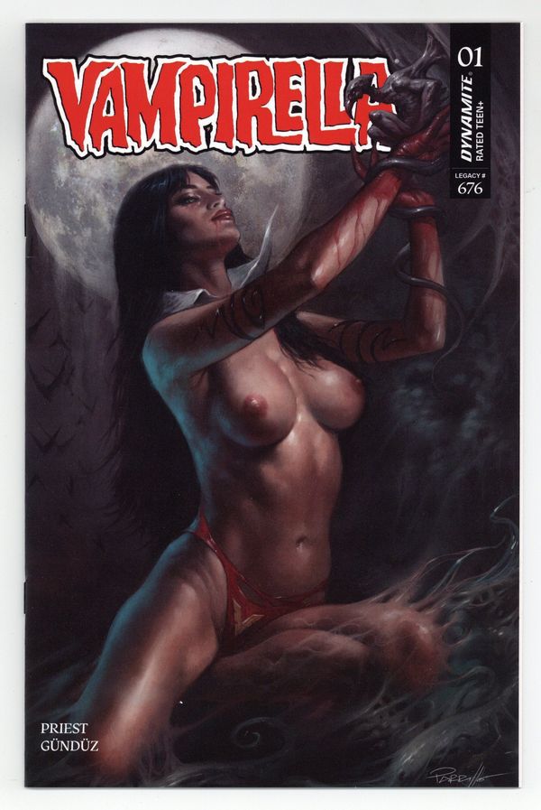 Starts Jan 3 WarrenLouwStore.Com Webstore Exclusive "Sensual Seductions" Edition Virgin Cover by Warren Louw. Written by Christopher Priest. Art by Ergun Gunduz. The team of Christopher Priest and Ergun Gunduz returns as 'The Long Night' begins! Vampirella's infant son, stolen by her evil twin Draculina, has finally been returned to her. But Vampi does not know the baby, has not bonded with him and, lost and alone, begins spiraling into postpartum depression. A mysterious figure named Cicero arrives, claiming to be Vampirella's infant son somehow transported 40+ years back from a dark future wherein Vampirella, consumed by bitterness, has become The Witch of Ashthorne, a ruthless matriarch responsible for a nuclear holocaust. Having finally rescued her baby from Draculina, Cicero begs Vampirella, for his sake and the sake of the world, to give the infant back. 32 pages, full color. Rated T+