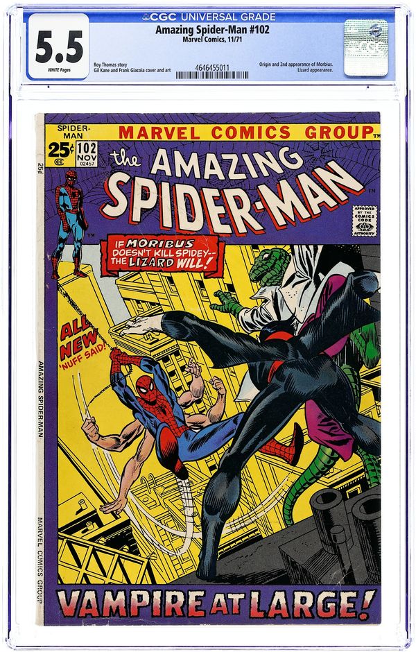 First appearance of Morbius the Living Vampire in "A Monster Called Morbius!" Script by Roy Thomas. Pencils by Gil Kane. Inks by Frank Giacoia. Cover by Gil Kane and John Romita. The first 100 issues of the Amazing Spider-Man title are in the books! And the next chapter in the web-slinger's anthology kicks off with the debut of Marvel's first bronze age vampire: Morbius! However, at the moment Peter Parker has a much bigger problem on his (six) hands. After drinking the special potion he developed, Aunt May's nephew grew four additional arms! Oh, my goodness! Peter is desperate to find a way to remove the arms, so he calls Dr. Curt Connors for help. Dr. Connors has a summer house and laboratory in Southampton on Long Island...and he gives Spider-Man permission to stay there and work on a cure. Meanwhile, a strange, pale, and bloodthirsty man is the sole survivor of a shipwreck near Southampton. And he's looking for a quiet place to rest. Oh no. Is the six-armed Spider-Man on a collision course with a living vampire? Oh yes! Cameo appearances by Gwen Stacy, J. Jonah Jameson, Joe Robertson, and the Lizard. Last 15¢ cover price. (Notes: This is the first issue of the Amazing Spider-Man series not written by Stan Lee. There exists a second printing of this issue published in 1992 with a silver background cover. Marvel also published a facsimile edition of Amazing Spider-Man 101 in 2021.) 36 pages. Cover price $0.15.