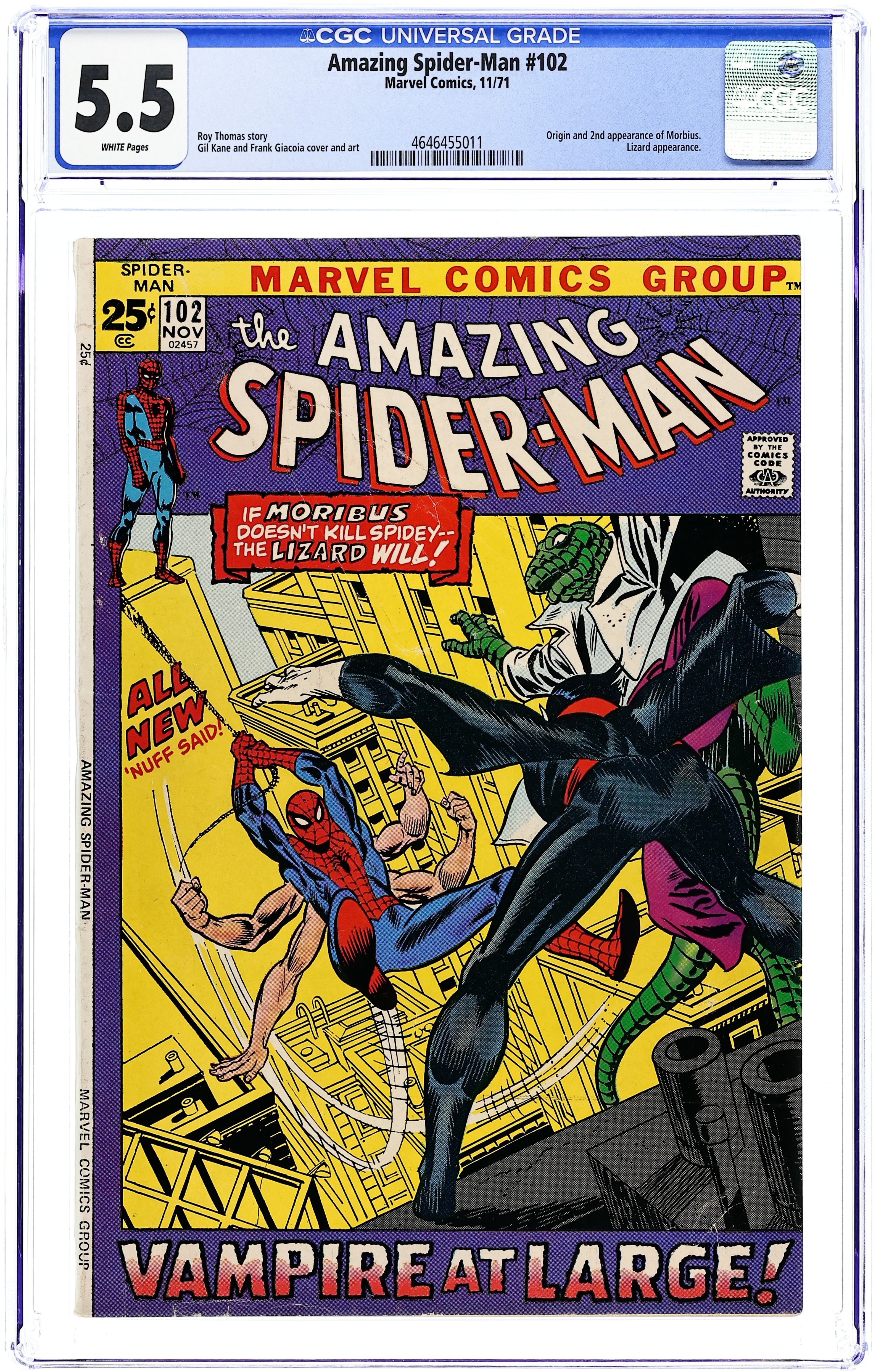 "Vampire at Large!" Double-Sized issue. Script by Roy Thomas. Pencils by Gil Kane. Inks by Frank Giacoia. Cover by Gil Kane and Frank Giacoia. The Amazing Spider-Man is on the ropes against the Living Vampire! The web-slinger (with his six arms) needs a miracle to survive the fangs of Morbius! And shockingly, he gets one -- that's crazy, green, and covered in scales: the Lethal Lizard! After a wild free-for-all, the wall-crawler and the Lizard drive Morbius out of Dr. Connors' summer home on Long Island. But they can't let the Living Vampire roam around New York City unchecked. Plus, the unlikely allies need a sample of Morbius' blood -- for the serum that might remove Peter Parker's extra arms! Wow, is this mission impossible for your friendly neighborhood Spider-Man? Good luck to the web-spinner and the Lizard too! Origin of Morbius. Cameo appearances by Gwen Stacy, Aunt May, J. Jonah Jameson, and Joe Robertson. Flashback cameos by Martine Bancroft and Emil Nikos. (Notes: Morbius appears next in Marvel Team-Up #3. Morbius' name is misspelled on the cover. This issue was reprinted in Marvel Tales 253.) 52 pages. Cover price $0.25.