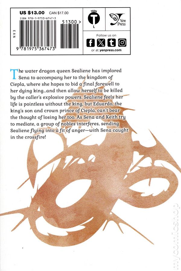 Volume 5 - 1st printing. Written by Tail Yuzuhara. Art and cover by sora. Translated by Timothy Gifford. Sena has freed the fire dragon king Gideon from his magical chains and learned about the motive behind Emperor Isaac's provocative actions. Plus, Keith is revealed to be a steerer, one who can draw upon the caller's powers. As Sena and Keith contemplate their futures, they are summoned by the water dragon queen Sealiene to the kingdom of Ciepra, where a civil war is brewing!?? Softcover, 5-in. x 7-in., 178 pages, B&W. Teen Cover price $13.00.