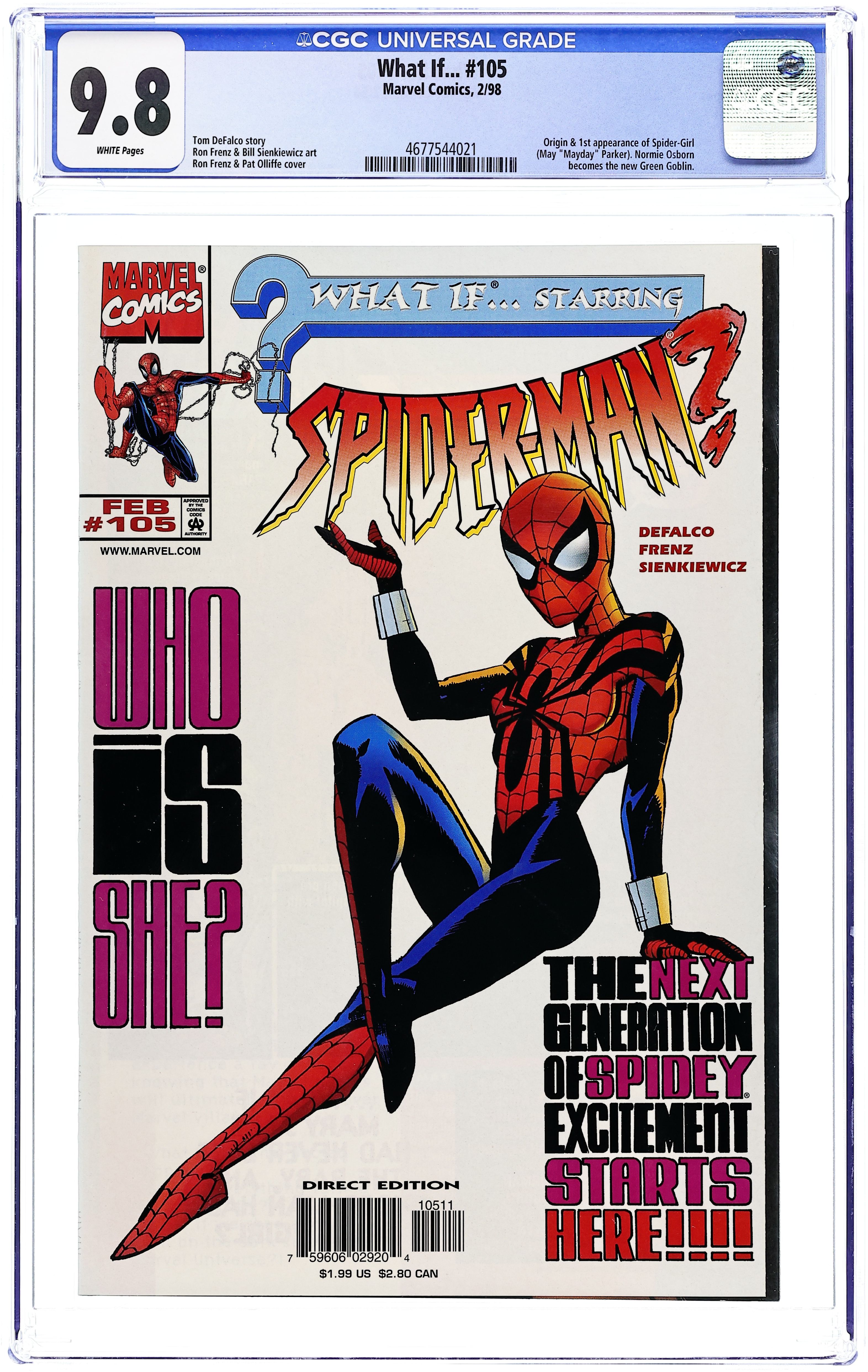 Direct Edition. Legacy...., script by Tom Defalco (Plot and Script) and Ron Frenz (Plot), pencils by Ron Frenz, inks by Bill Sienkiewicz; In the future, the grown Normie Osborn becomes the Greeen Goblin and the daughter of Spider-Man must stop him; introduction and Origin of Spider-Girl. 38 pages, full color. Cover price $1.99.