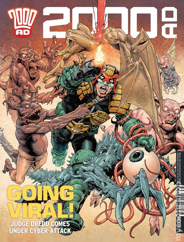 September 14, 2016. Cover by Chris Blythe. Judge Dredd "Ladykiller" Part 8 (W) John Wagner (A) Carlos Ezquerra, Jaegir "Warchild" Part 3 (W) Gordon Rennie (A) Simon Coleby, Scarlet Traces "Cold War" Part 11 (W) Ian Edginton (A) DIsraeli, Outlier "Survivor Guilt" Part 9 (W) T.C. Eglington (A) Karl Richardson, Anderson Psi-Division "The Candidate" Part 6 (W) Emma Beeby (A) Nick Dyer.