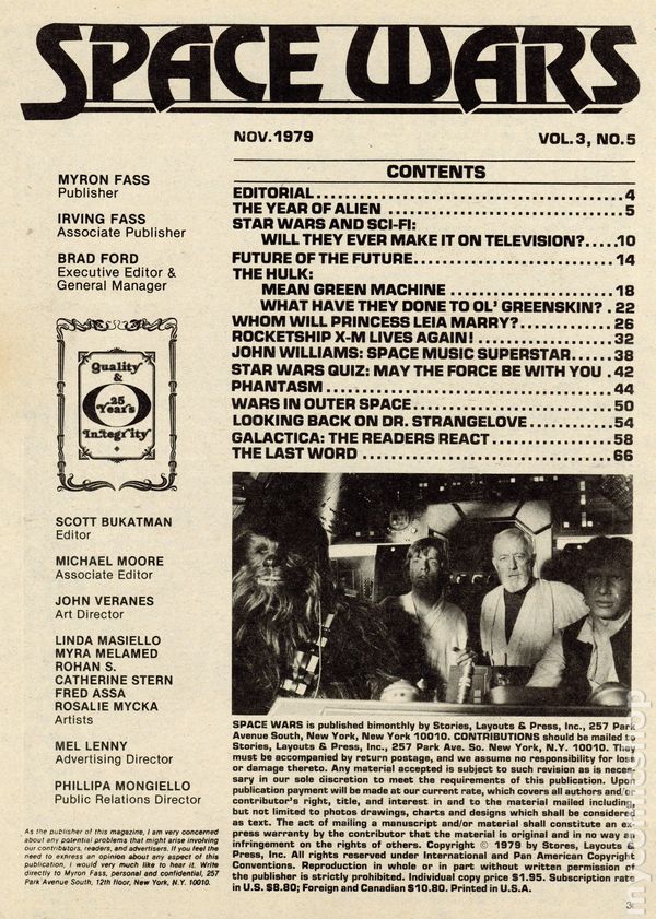 Vol. 3 No. 5, November 1979. Includes the following: The Year of Alien, Star Wars and Sci-Fi: Will They Ever Make it on Television, The Hulk: Green Machine, What Have They Done to Ol' Greenskin?, Whom Will Princess Leia Marry?, Rocketship X-M Lives Again, John Williams: Space Music Superstar, Star Wars Quiz, Looking Back on Dr. Strangelove, and Galactica: The Readers React. 66 pgs. Cover price $1.95.
