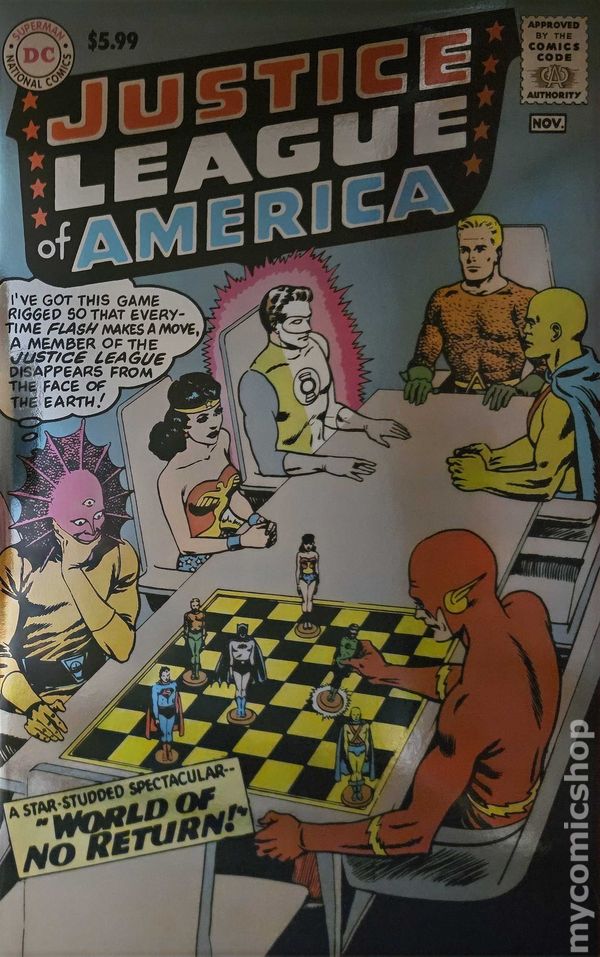 Foil Cover. Written by Gardner Fox. Art by Mike Sekowsky, Bernard Sachs. Cover by Murphy Anderson. In this facsimile of the premiere issue of the JLA's first self-titled series, the fate of the world's greatest superhero team rests on the outcome of a chess match against Despero! A superstar-studded spectacular that helped launch one of DC's longest-running titles and all the Silver Age superhero teams that followed! 32 pages, full color. Rated T+ Cover price $5.99.