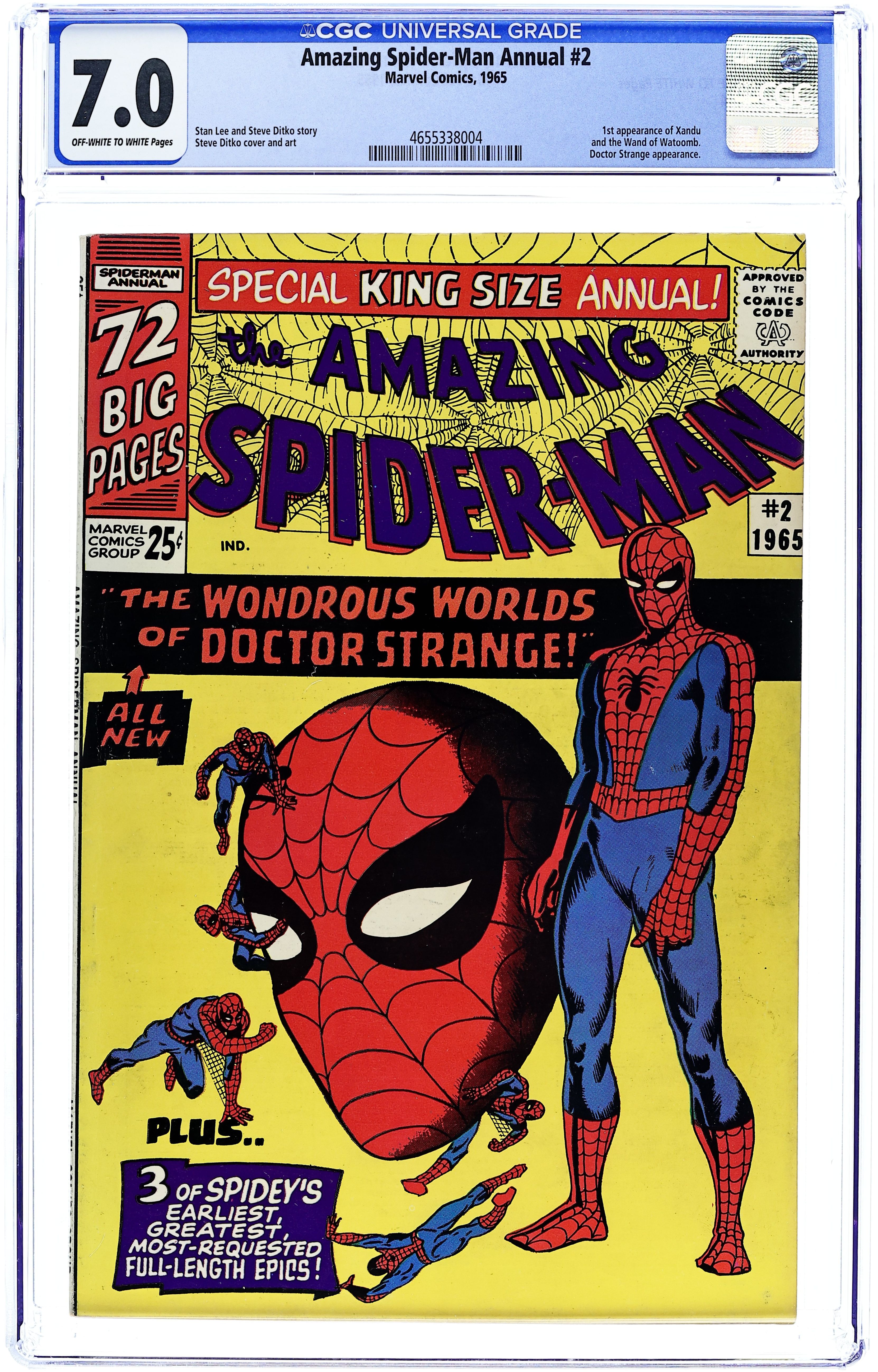 Starts Jan 3 Cover art by Steve Ditko. Doctor Strange guest stars in an all-new 20-page story, "The Wondrous World of Doctor Strange!", script by Stan Lee, art by Steve Ditko; Xandu sends his two henchmen to retrieve half of the Wand of Watoomb from Dr. Strange; Spider-Man mistakes the henchmen for burglars and tries to stop them, leading to a team up between Spider-Man and Dr. Strange to stop Xandu's plan. Spider-Man, script by Stan Lee, art by Steve Ditko; Spider-Man rescues John Jameson, J. Jonah Jameson's son, from his malfunctioning space capsule; reprinted from Amazing Spider-Man 1. The Uncanny Threat of the Terrible Tinkerer!, script by Stan Lee, art by Steve Ditko; When Peter Parker discovers some alien modifications to a professor's radio he tracks down a group of aliens with plans to take over the Earth; reprinted from Amazing Spider-Man 2. Marked for Destruction by Dr. Doom!, script by Stan Lee, art by Steve Ditko; Dr. Doom tries to trick Spider-Man into helping him defeat the Fantastic Four. Ditko also provides 5 pages of new pin-ups (Spider-Man's famous foes). Finally, there are three reprints from Amazing Spider-Man 1 ("Spider-Man"), 2 ("The Uncanny Threat of the Terrible Tinkerer!"), and 5 ("Marked for Destruction by Dr. Doom!"). Giant 76-page special! Reprinted in Marvel Tales # 167. 76 pgs., full color. Cover price $0.25.