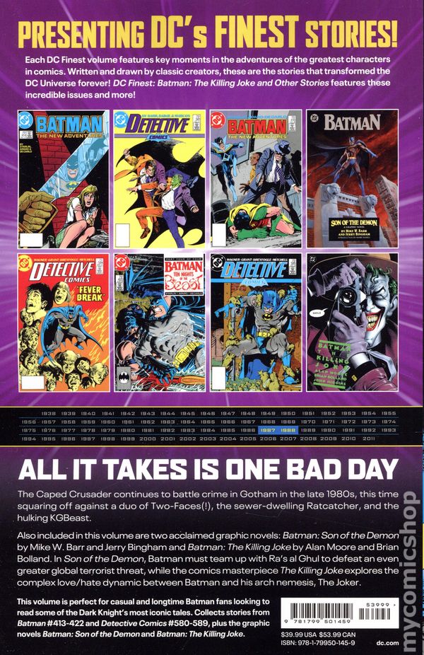 2nd and later printings. Collects Batman (1940-2011) #413-422, Detective Comics (1937-2011 1st Series) #580-589, Batman: Son of the Demon GN (1988 DC), and Batman: The Killing Joke (1988). Written by Jo Duffy, Jim Starlin, Mike Barr, John Wagner, Alan Grant, Lewis Klahr and Steve Piersall, and Alan Moore. Art by Kieron Dwyer, Jim Aparo, Dick Giordano, Mark Bright, Jim Baikie, Norm Breyfogle, Dean Haspiel, Jerry Bingham, Brian Bolland, Mike DeCarlo, Joe Rubinstein, Steve Mitchell, Pablo Marcos, Kim DeMulder, Ricardo Villagran, and Denis Rodier. Cover by Brian Bolland. The Caped Crusader continues to battle crime in Gotham in the late 1980s, this time squaring off against villains such as Two-Face, the Ratcatcher, and KGBeast. This volume also contains two celebrated graphic novels--BATMAN: SON OF THE DEMON #1 by Mike W. Barr and Jerry Bingham and BATMAN: THE KILLING JOKE #1 by Alan Moore and Brian Bolland, the comics masterpiece that explored the complex dynamic between Batman and his archnemesis, The Joker. Softcover, 6-in. x 9-in., 608 pages, full color. Teen Cover price $39.99.