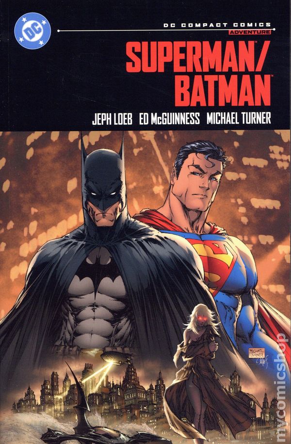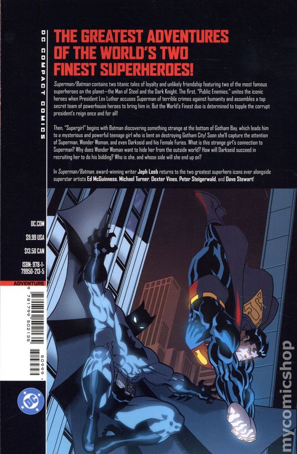 Volume 1 - 2nd and later printings. Collects Superman/Batman (2003-2011) #1-13 and Superman Batman Secret Files and Origins (2003 DC). Written by Jeph Loeb. Art by Ed McGuinness, Michael Turner, Dexter Vines, Peter Steigerwald, Dave Stewart, Pat Lee, Tim Sale, and Mark Chiarello. Cover by Michael Turner and Peter Steigerwald. Back Cover by Ed McGuinness. Superman/Batman: Book One contains two titanic tales of loyalty and unlikely friendship featuring two of the most famous superheroes on the planet. The first, "Public Enemies," unites the iconic heroes when President Lex Luthor accuses Superman of terrible crimes against humanity and assembles a top-secret team of powerhouse heroes. But the World's Finest duo are determined to topple the corrupt president's reign once and for all! Then, "Supergirl" begins with Batman discovering something strange at the bottom of Gotham Bay, which leads him to a mysterious and powerful teenage girl who is bent on destroying Gotham City! Soon she'll attract the attention of Superman, Wonder Woman, and even Darkseid and his Female Furies. What is this strange girl's connection to Superman? Why does Wonder Woman want to hide her from the outside world? How will Darkseid succeed in recruiting her to do his bidding? Who is she, and whose side will she choose? In Superman/Batman: Book One, award-winning writer Jeph Loeb returns alongside superstar artists Ed McGuinness, Michael Turner, Dexter Vines, and Dave Stewart! Softcover, 5 1/2-in. x 8-in., 304 pages, full color. Teen Cover price $9.99.