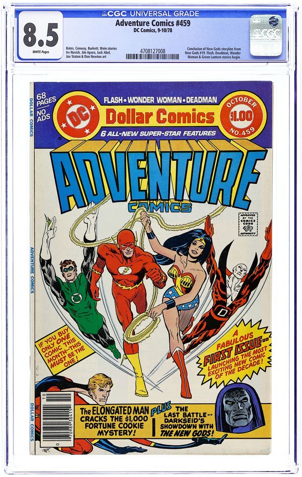 Starts May 18 Change to dollar format. The Crimson Comets of Fallville High starring Flash, script by Cary Bates, pencils by Irv Novick, inks by Frank Mclaughlin. Murder Haunts the Midway starring Deadman, script by Len Wein, art by Jim Aparo. The Call of the Cosmos starring Green Lantern, script by Cary Burkett, art by Joe Staton. Climax of Chaos starring the New Gods, script by Gerry Conway, pencils by Don Newton, inks by Augie Scotto; Story continues from New Gods #19. The Case of the Fortune Cookie Fortune starring the Elongated Man, script by Len Wein, Paul Levitz, Mike Gold, Ann Delary-Gold, and Steve Mitchell, pencils by George Ruppert, inks by Bruce Patterson. The Shark's Dark Demand starring Wonder Woman, script by Jack C. Harris, pencils by Jack Abel, inks by Frank Giacoia. 68 Pages, Full Color. Cover price $1.00.