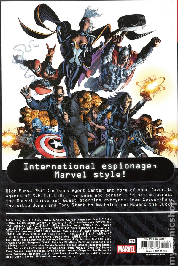 1st printing. Collects stories from SHIELD (2015 Marvel 4th Series) #1-12; Agents of SHIELD (2016) #1-10; All New All Different Point One (2015 Marvel), Agent Carter S.H.I.E.L.D. 50th Anniversary (2015), The Cavalry S.H.I.E.L.D. 50th Anniversary (2015), Fury: S.H.I.E.L.D. 50th Anniversary (2015), Mockingbird: S.H.I.E.L.D. 50th Anniversary (2015), Quake: S.H.I.E.L.D. 50th Anniversary (2015), and Fury (2023 Marvel) #1. Written by Mark Waid, Joe Quesada, Paul Mounts, Marc Guggenheim, Kathryn Immonen, Jody Houser, David F. Walker, Chelsea Cain, Patrick Kindlon, Matthew Rosenberg, and Al Ewing. Art by Carlos Pacheco, Mariano Taibo, Humberto Ramos, Victor Olazaba, Alan Davis, Mark Farmer, Christopher Sprouse, Karl Story, Michael Choi, Paul Renaud, Greg Smallwood, Paco Medina, Juan Vlasco, Lee Ferguson, Evan Shaner, Howard Chaykin, Joe Bennett, Alejandro Sicat, Germán Peralta, Ario Anindito, Richard Ellis, Luke Ross, Lee Ferguson, Joëlle Jones, Daniel Warren Johnson, Scot Eaton, Tom Reilly, Adam Kubert, Ramon Rosanas, and Cam Smith. Cover by Mike Morton. Back Cover Cover by Mike Deodato. Additional Material by Jack Kirby, Jim Steranko, John Severin, and Stan Lee. Your favorite agents of S.H.I.E.L.D. from page and screen in action across the Marvel Universe! High-tech weapons. High-stakes missions. High-octane adventure! For the agents of S.H.I.E.L.D., its just another day in the field! Special Agent Phil Coulson brings together the best and the brightest, the gifted and the elite, normal people and superhumans on an as-needed basis to confront, combat and curtail dangers beyond the scope of any conventional peace-keeping force! Welcome to Level Eight. Welcome to S.H.I.E.L.D.! Daisy Johnson, A.K.A. Quake, faces a seismic family reunion! Agent May and Mockingbird confront an army of super-powered monstrosities! Nick Fury is forced to team up with his father, Nick Fury Sr.! Fitz risks his life; Simmons battles for hers! Plus: Coulson is reunited with his great love, Lola — no, not the flying car! Featuring Tony Stark, Spider-Man, Wolverine, Deathlok, Howard the Duck and more! Hardcover, 8 1/2-in. x 11-in., 696 pages, full color. Rated T+ Cover price $100.00.