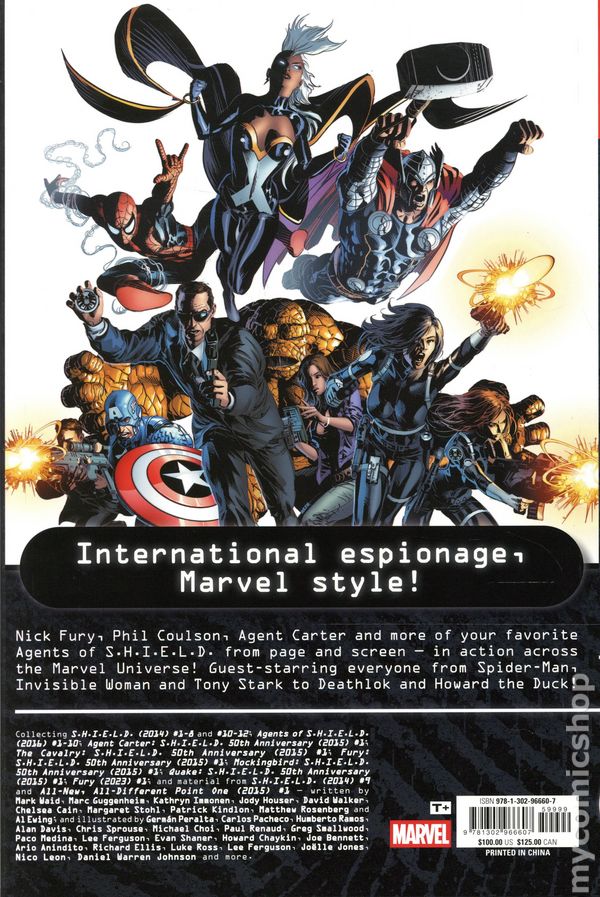 1st printing. Collects stories from SHIELD (2015 Marvel 4th Series) #1-12; Agents of SHIELD (2016) #1-10; All New All Different Point One (2015 Marvel), Agent Carter S.H.I.E.L.D. 50th Anniversary (2015), The Cavalry S.H.I.E.L.D. 50th Anniversary (2015), Fury: S.H.I.E.L.D. 50th Anniversary (2015), Mockingbird: S.H.I.E.L.D. 50th Anniversary (2015), Quake: S.H.I.E.L.D. 50th Anniversary (2015), and Fury (2023 Marvel) #1. Written by Mark Waid, Joe Quesada, Paul Mounts, Marc Guggenheim, Kathryn Immonen, Jody Houser, David F. Walker, Chelsea Cain, Patrick Kindlon, Matthew Rosenberg, and Al Ewing. Art by Carlos Pacheco, Mariano Taibo, Humberto Ramos, Victor Olazaba, Alan Davis, Mark Farmer, Christopher Sprouse, Karl Story, Michael Choi, Paul Renaud, Greg Smallwood, Paco Medina, Juan Vlasco, Lee Ferguson, Evan Shaner, Howard Chaykin, Joe Bennett, Alejandro Sicat, Germán Peralta, Ario Anindito, Richard Ellis, Luke Ross, Lee Ferguson, Joëlle Jones, Daniel Warren Johnson, Scot Eaton, Tom Reilly, Adam Kubert, Ramon Rosanas, and Cam Smith. Cover by Julian Totino Tedesco. Back Cover by Mike Deodato. Additional Material by Jack Kirby, Jim Steranko, John Severin, and Stan Lee. Your favorite agents of S.H.I.E.L.D. from page and screen in action across the Marvel Universe! High-tech weapons. High-stakes missions. High-octane adventure! For the agents of S.H.I.E.L.D., its just another day in the field! Special Agent Phil Coulson brings together the best and the brightest, the gifted and the elite, normal people and superhumans on an as-needed basis to confront, combat and curtail dangers beyond the scope of any conventional peace-keeping force! Welcome to Level Eight. Welcome to S.H.I.E.L.D.! Daisy Johnson, A.K.A. Quake, faces a seismic family reunion! Agent May and Mockingbird confront an army of super-powered monstrosities! Nick Fury is forced to team up with his father, Nick Fury Sr.! Fitz risks his life; Simmons battles for hers! Plus: Coulson is reunited with his great love, Lola — no, not the flying car! Featuring Tony Stark, Spider-Man, Wolverine, Deathlok, Howard the Duck and more! Hardcover, 8 1/2-in. x 11-in., 696 pages, full color. Rated T+ Cover price $100.00.