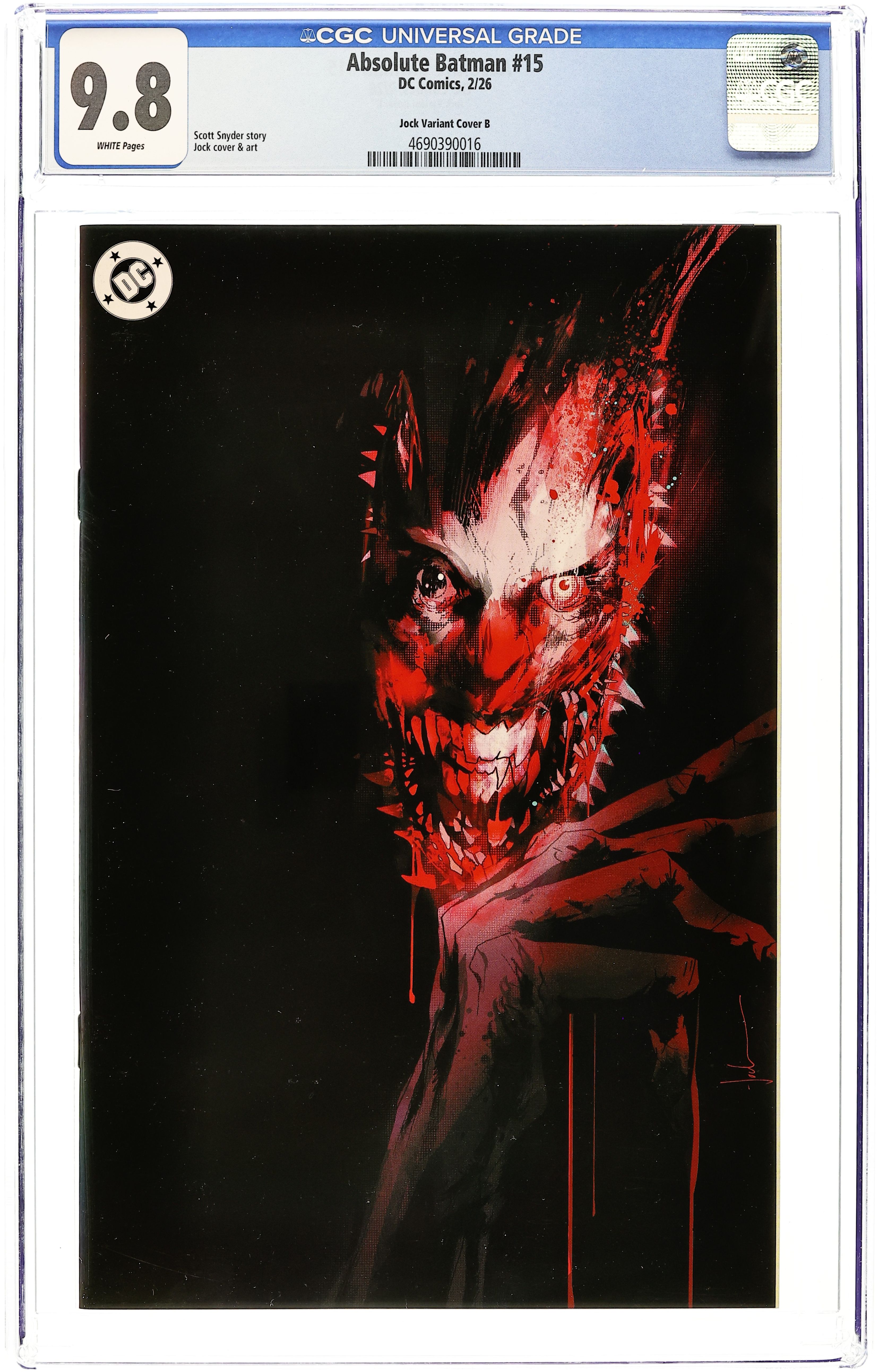 Starts Mar 16 (W) Scott Snyder (A) Jock (CA) Ben Oliver SCOTT SNYDER REUNITES WITH LEGENDARY ARTIST JOCK! Alfred reveals to Bruce the story of the man hes been chasing for years. Enter: Joker! Scott Snyder and Jock reunite for an epic tale in the Absolute Universe! 32 pages, full color, rated 15+. Cover price $5.99.