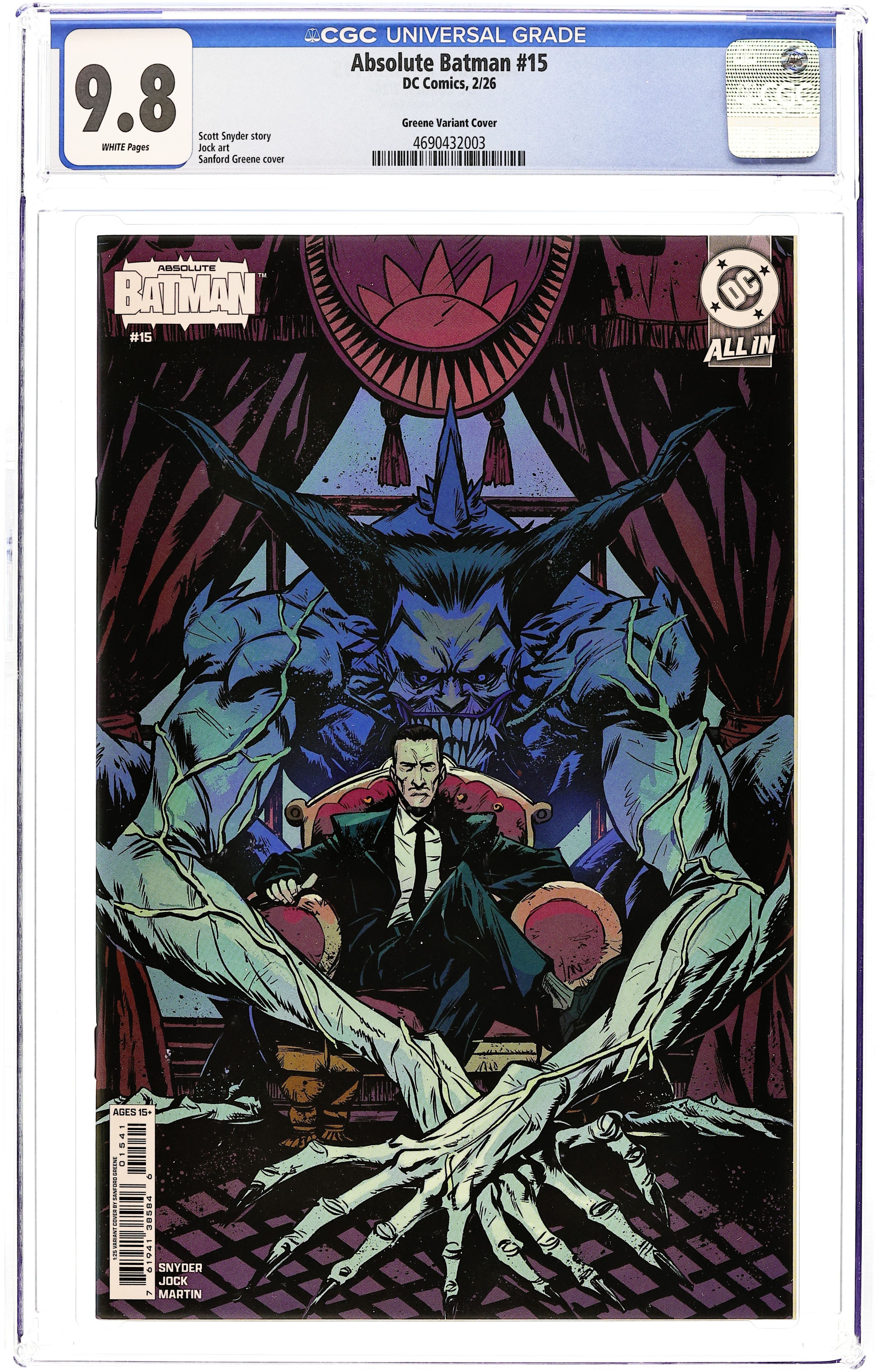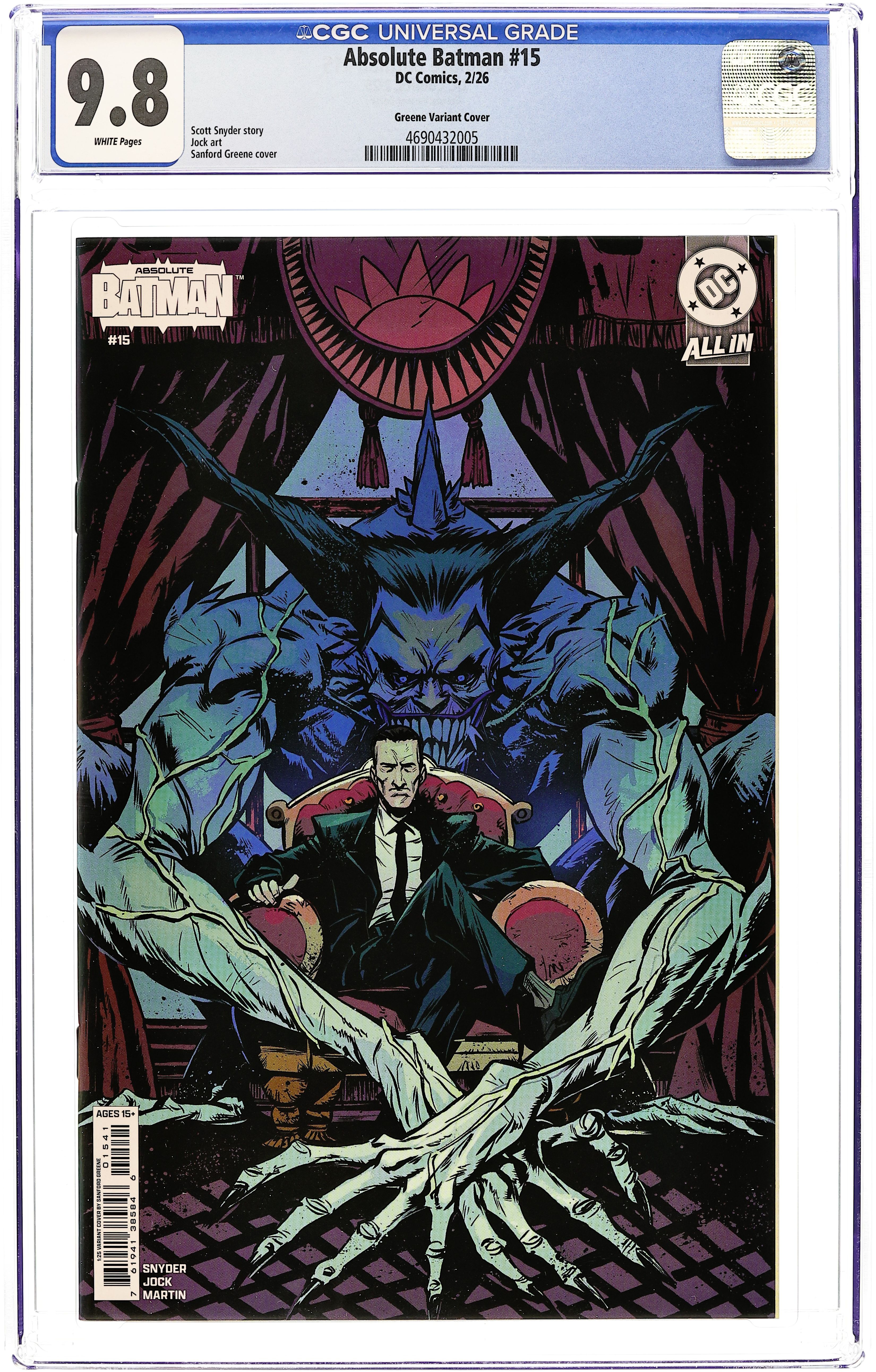 Starts Mar 16 Limited 1 for 25 Retailer Incentive Variant Cover.(W) Scott Snyder (A) Jock (CA) Sanford Greene SCOTT SNYDER REUNITES WITH LEGENDARY ARTIST JOCK! Alfred reveals to Bruce the story of the man hes been chasing for years. Enter: Joker! Scott Snyder and Jock reunite for an epic tale in the Absolute Universe! Cover price $5.99.
