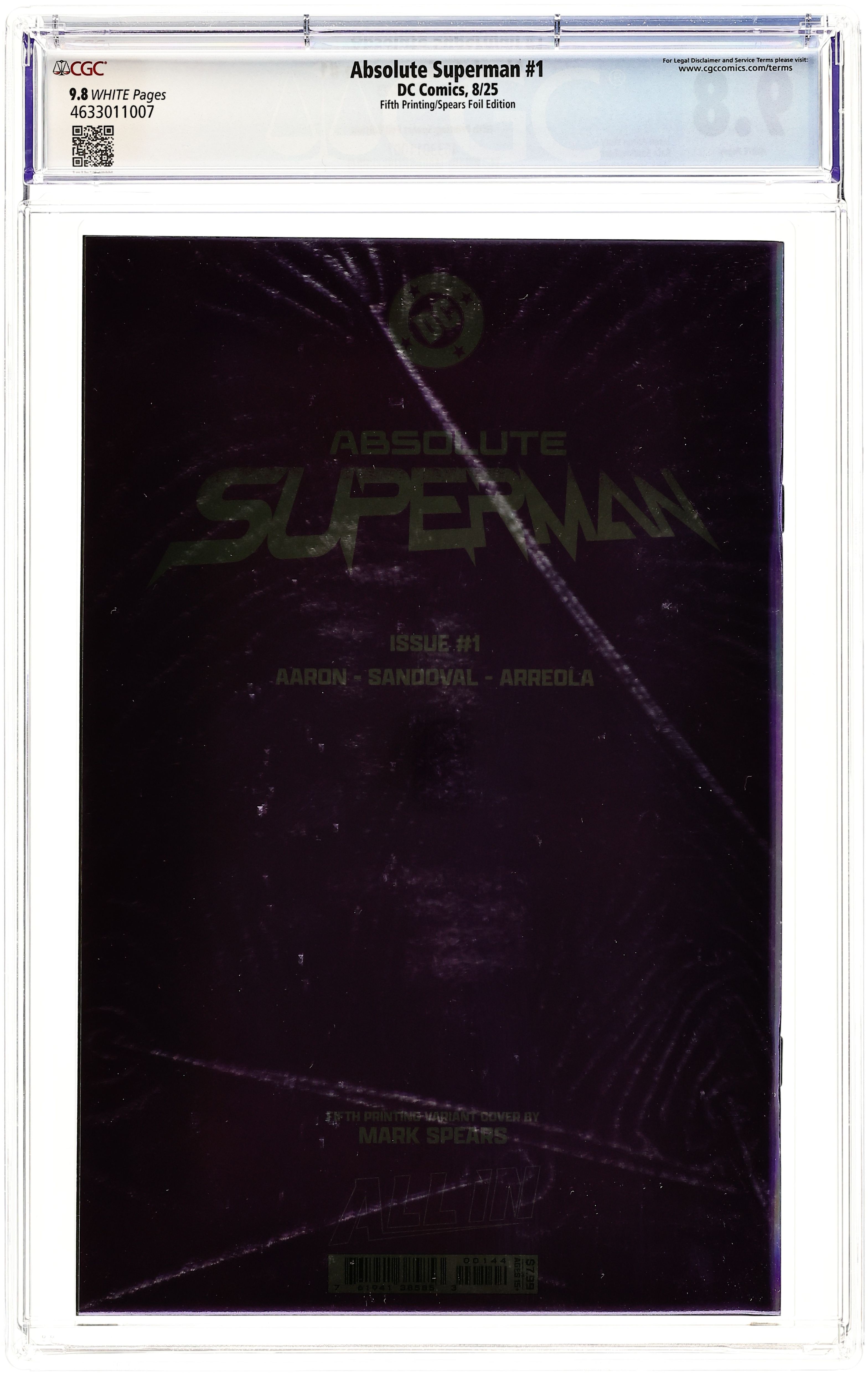5th Printing. Cover C. Written by Jason Aaron. Art by Rafa Sandoval. Cover by Mark Spears. SUPERSTARS JASON AARON AND RAFA SANDOVAL UNLEASH A SHOCKING NEW TAKE ON THE LAST SON OF KRYPTON! Without the fortress...without the family...without a home...what's left is the Absolute Man of Steel! 48 pages, full color. Rated T+ Cover price $4.99.