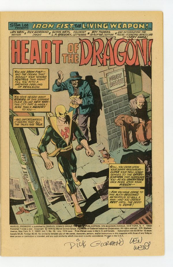 Ended Mar 19 2024 Winning Bid $46 Cover pencils by Gil Kane, inks by Dick Giordano. Heart of the Dragon!, script by Roy Thomas (co-plotter) and Len Wein, pencils by Larry Hama, inks by Dick Giordano and Klaus Janson; Danny completes his training in K'un-Lun and acquires the power of the Iron Fist but rather than partake of immortality, he decides to return to his own world and seek vengeance against his parents' killer, Harold Meachum; On arriving in New York, Danny faces assassins who are trying to collect a ten thousand dollar bounty against him. The letters page contains a text feature by Tony Isabella and Marvel Value Stamp series A # 71 (the Vision by John Buscema). 36 pgs. $0.25. NOTE: 2nd appearance and origin of Iron Fist. Cover price $0.25. Grade: FN+ 6.5 explanation of grade Condition: Used (collectible)