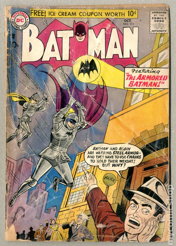 Cover by Sheldon Moldoff. "The Gotham City Safari," script by Bill Finger, pencils by Sheldon Moldoff (as Bob Kane), inks by Charles Paris; Batman and Robin are invited to become members of the famed Safari Club is quickly followed by the murder of one of the members, and the Dynamic Duo soon find themselves on a "safari" to ferret out the killer...before he kills them! One-page Warden Willis story by Henry Boltinoff. "How NOT to Enjoy a Vacation!" text story. "The Other Bruce Wayne," script by Bill Finger, pencils by Sheldon Moldoff (as Bob Kane), inks by Charles Paris; Commissioner Gordon has a surprise for Bruce: a relative of his from the coast who decides to teach Bruce how to be a great detective! One-page Casey the Cop story by Henry Boltinoff. "The Wild Ride of Squad Car 12" text article. "The Armored Batman," script by Edmond Hamilton, pencils by Sheldon Moldoff, inks by Stan Kaye; All of Gotham City is puzzled by Batman and Robin's odd behavior and strange costuming when they hear of a man named Blair Graeme threatening the Caped Crusaders. 36 Pages, Full Color. Cover price $0.10. Grade: PR 0.5 explanation of grade Condition: Used (collectible)