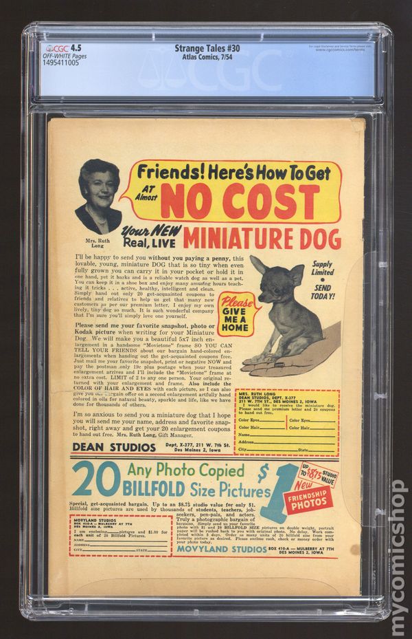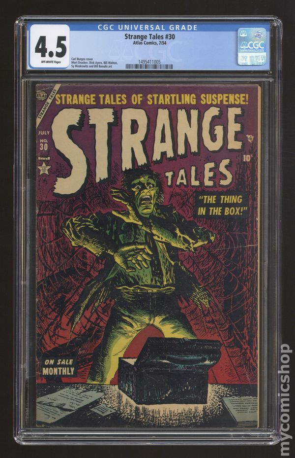"Science Fiction" (art Bill Benulis), "Look, Ma--a Vampire," "Kill Him!" (art by Bill Walton), "The Slimy Things" (art by Sam Moskowitz), "The Thing in the Box!" (art by Dick Ayers), and a two-page text story, "The Smile of Mrs. Orko." 36 pgs. Cover price $0.10. Grade: CGC 4.5 explanation of grade Condition: Used (collectible)